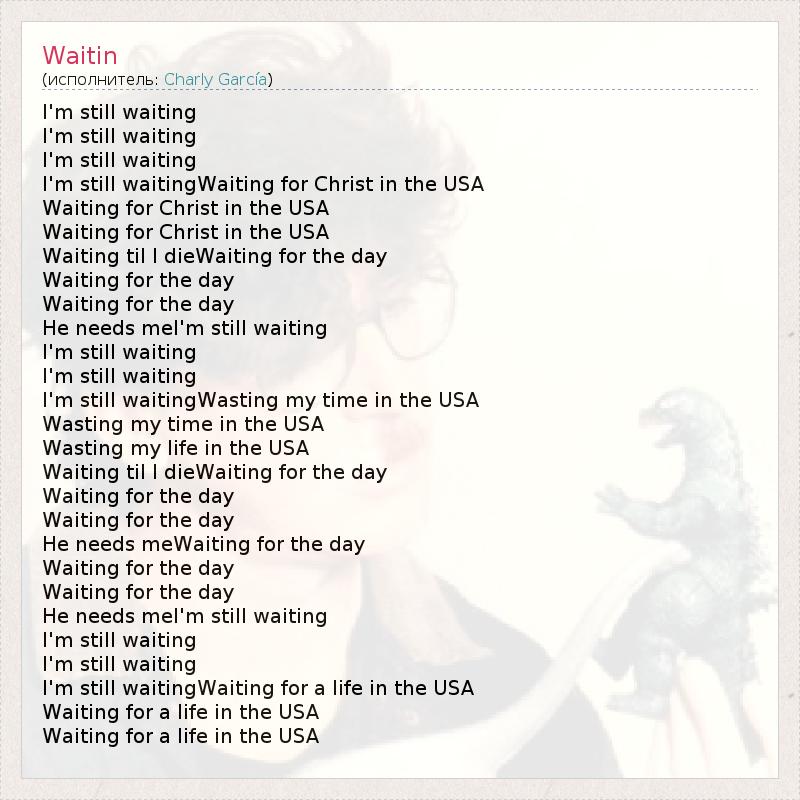 I'm still waiting I'm still waiting I'm still waiting I'm still waitingWaiting for Christ in the USA Waiting for Christ in the USA Waiting for Christ in the USA Waiting til I dieWaiting for the day Waiting for the day Waiting for the day He needs meI'm still waiting I'm still waiting I'm still waiting I'm still waitingWasting my time in the USA Wasting my time in the USA Wasting my life in the USA Waiting til I dieWaiting for the day Waiting for the day Waiting for the day He needs meWaiting for the day Waiting for the day Waiting for the day He needs meI'm still waiting I'm still waiting I'm still waiting I'm still waitingWaiting for a life in the USA Waiting for a life in the USA Waiting for a life in the USA