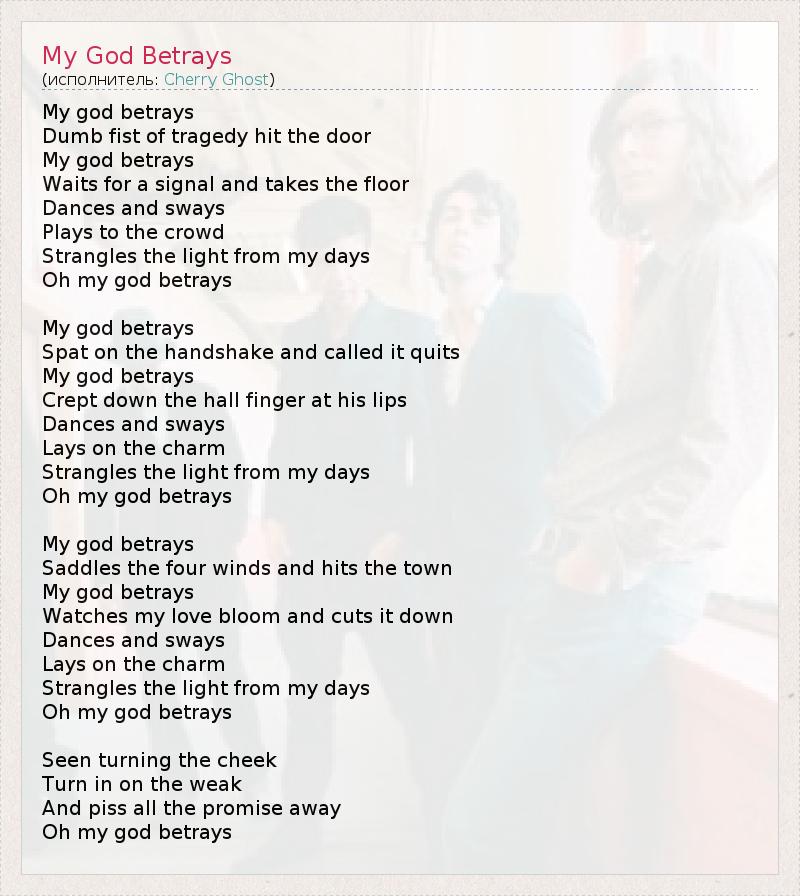 My god betrays Dumb fist of tragedy hit the door My god betrays Waits for a signal and takes the floor Dances and sways Plays to the crowd Strangles the light from my days Oh my god betrays My god betrays Spat on the handshake and called it quits My god betrays Crept down the hall finger at his lips Dances and sways Lays on the charm Strangles the light from my days Oh my god betrays My god betrays Saddles the four winds and hits the town My god betrays Watches my love bloom and cuts it down Dances and sways Lays on the charm Strangles the light from my days Oh my god betrays Seen turning the cheek Turn in on the weak And piss all the promise away Oh my god betrays