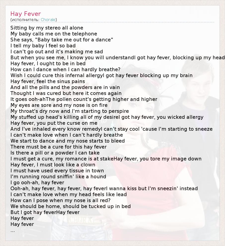 Ooh-ah, hay fever, hay fever, hay feverI wanna kiss but I'm sneezin' instead