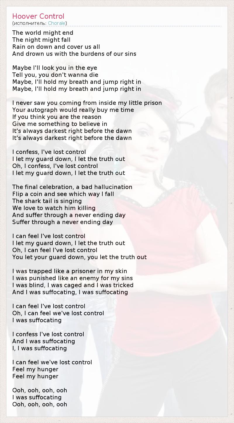 Может настать конец света, Может опуститься ночь, Накрыть и поглотить И утопить нас в наших грехах. Быть может, я загляну тебе в глаза, Скажу, чтобы и не думал умирать. Быть может, я задержу дыхание и брошусь прямо в гущу событий, Быть может, я задержу дыхание и брошусь сломя голову. Я ни разу не видела, чтобы ты выбирался из моей маленькой тюрьмы, Твой автограф и правда дал бы мне запас времени. Если ты считаешь себя первопричиной, То покажи, во что я могу поверить. Перед рассветом всегда темней всего, Перед рассветом всегда темней всего... Сознаюсь, я утратила контроль, Я потеряла бдительность, я раскрыла правду. О, сознаюсь, я утратила контроль, Я потеряла бдительность, я раскрыла правду... Финальное торжество, ужасная галлюцинация, Подбрось монетку и узнай, как я упаду. Хвост акулы разрезает волны, Мы любим смотреть, как она убивает, И проводить в страданиях бесконечные дни, И проводить в страданиях бесконечные дни. Я чувствую, что утратила контроль, Я потеряла бдительность, я раскрыла правду. О, я чувствую, что утратила контроль, Ты потерял бдительность, ты раскрыл правду. Я была пленницей своего тела, Меня наказали, как врага, за мои грехи, Заточили в клетку, я была слепа и обманута, И я задыхалась, я задыхалась... Я чувствую, что утратила контроль, О, я чувствую, что мы утратили контроль, Я задыхалась... Я сознаюсь, что утратила контроль, И я задыхалась, Я задыхалась... Я чувствую, что мы утратили контроль, Почувствуй мою жажду, Почувствуй мою жажду... О, о, о, о, Я задыхалась, О, о, о, о...