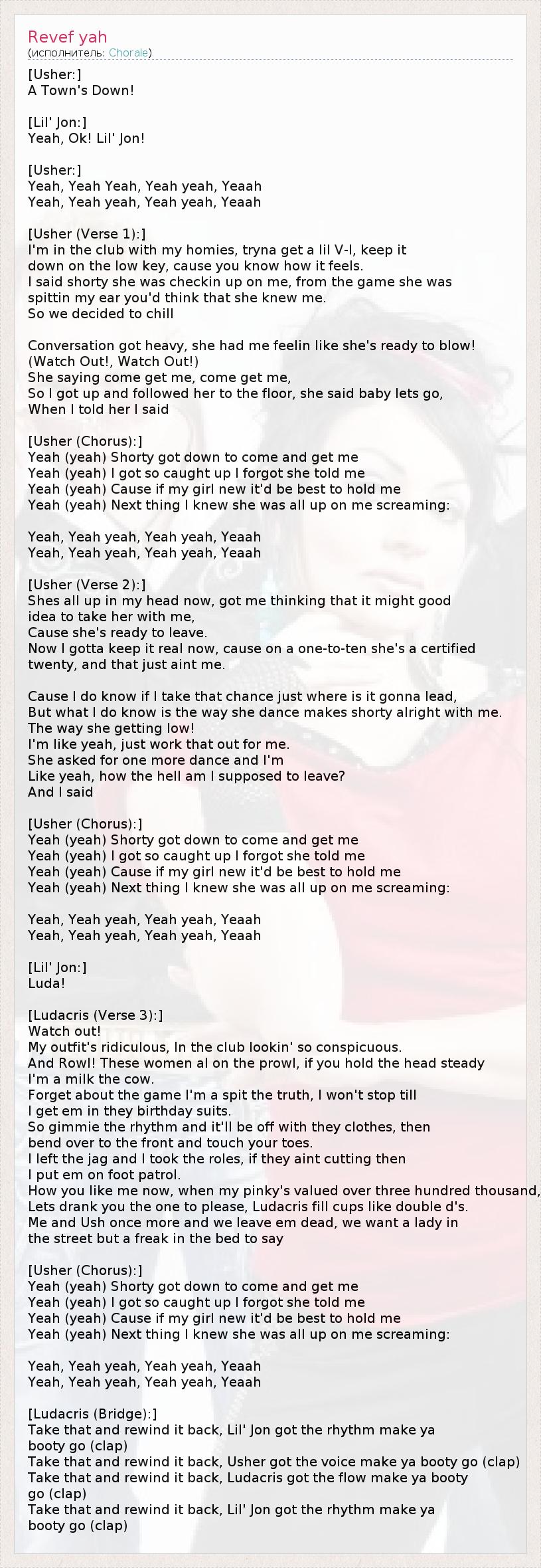 [Usher:] A Town's Down! [Lil' Jon:] Yeah, Ok! Lil' Jon! [Usher:] Yeah, Yeah Yeah, Yeah yeah, Yeaah Yeah, Yeah yeah, Yeah yeah, Yeaah [Usher (Verse 1):] I'm in the club with my homies, tryna get a lil V-I, keep it down on the low key, cause you know how it feels. I said shorty she was checkin up on me, from the game she was spittin my ear you'd think that she knew me. So we decided to chill Conversation got heavy, she had me feelin like she's ready to blow! (Watch Out!, Watch Out!) She saying come get me, come get me, So I got up and followed her to the floor, she said baby lets go, When I told her I said [Usher (Chorus):] Yeah (yeah) Shorty got down to come and get me Yeah (yeah) I got so caught up I forgot she told me Yeah (yeah) Cause if my girl new it'd be best to hold me Yeah (yeah) Next thing I knew she was all up on me screaming: Yeah, Yeah yeah, Yeah yeah, Yeaah Yeah, Yeah yeah, Yeah yeah, Yeaah [Usher (Verse 2):] Shes all up in my head now, got me thinking that it might good idea to take her with me, Cause she's ready to leave. Now I gotta keep it real now, cause on a one-to-ten she's a certified twenty, and that just aint me. Cause I do know if I take that chance just where is it gonna lead, But what I do know is the way she dance makes shorty alright with me. The way she getting low! I'm like yeah, just work that out for me. She asked for one more dance and I'm Like yeah, how the hell am I supposed to leave? And I said [Usher (Chorus):] Yeah (yeah) Shorty got down to come and get me Yeah (yeah) I got so caught up I forgot she told me Yeah (yeah) Cause if my girl new it'd be best to hold me Yeah (yeah) Next thing I knew she was all up on me screaming: Yeah, Yeah yeah, Yeah yeah, Yeaah Yeah, Yeah yeah, Yeah yeah, Yeaah [Lil' Jon:] Luda! [Ludacris (Verse 3):] Watch out! My outfit's ridiculous, In the club lookin' so conspicuous. And Rowl! These women al on the prowl, if you hold the head steady I'm a milk the cow. Forget about the game I'm a spit the truth, I won't stop till I get em in they birthday suits. So gimmie the rhythm and it'll be off with they clothes, then bend over to the front and touch your toes. I left the jag and I took the roles, if they aint cutting then I put em on foot patrol. How you like me now, when my pinky's valued over three hundred thousand, Lets drank you the one to please, Ludacris fill cups like double d's. Me and Ush once more and we leave em dead, we want a lady in the street but a freak in the bed to say [Usher (Chorus):] Yeah (yeah) Shorty got down to come and get me Yeah (yeah) I got so caught up I forgot she told me Yeah (yeah) Cause if my girl new it'd be best to hold me Yeah (yeah) Next thing I knew she was all up on me screaming: Yeah, Yeah yeah, Yeah yeah, Yeaah Yeah, Yeah yeah, Yeah yeah, Yeaah [Ludacris (Bridge):] Take that and rewind it back, Lil' Jon got the rhythm make ya booty go (clap) Take that and rewind it back, Usher got the voice make ya booty go (clap) Take that and rewind it back, Ludacris got the flow make ya booty go (clap) Take that and rewind it back, Lil' Jon got the rhythm make ya booty go (clap)