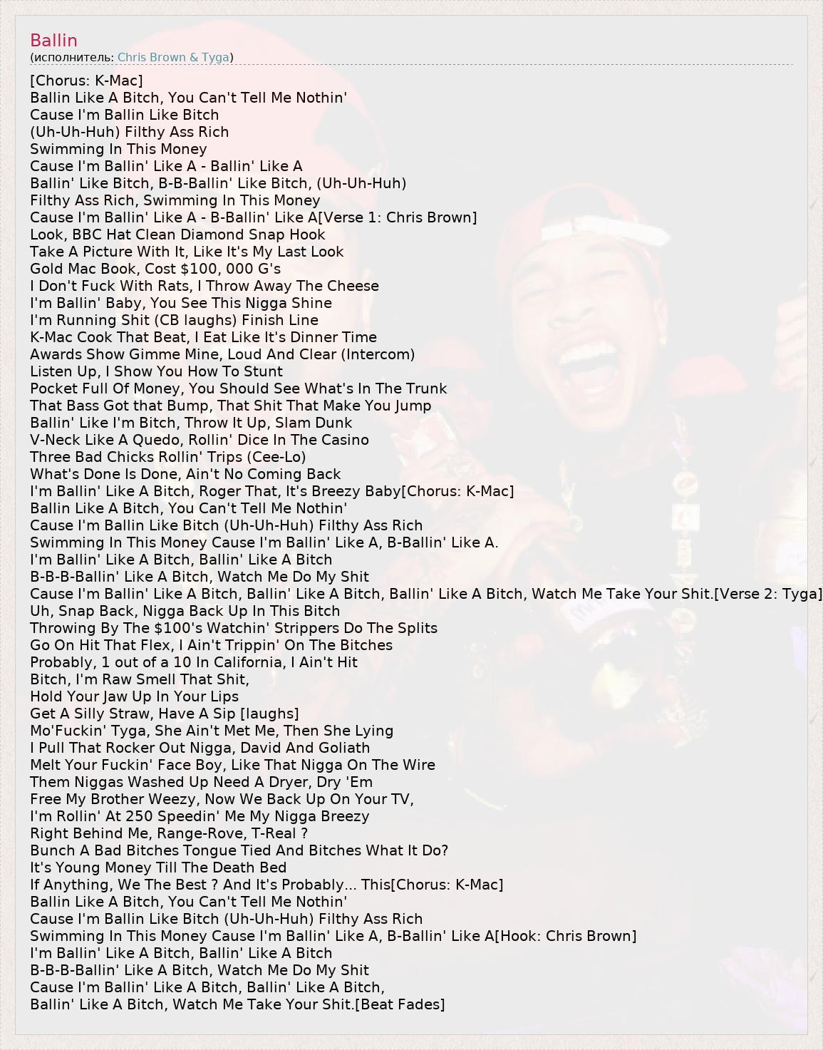 Cause I'm Ballin' Like A Bitch, Ballin' Like A Bitch, Ballin' Like A Bitch, Watch Me Take Your Shit.[Verse 2: Tyga]