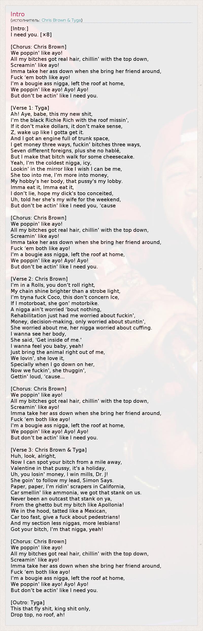 [Intro:] I need you. [×8] [Chorus: Chris Brown] We poppin' like ayo! All my bitches got real hair, chillin' with the top down, Screamin' like ayo! Imma take her ass down when she bring her friend around, Fuck ‘em both like ayo! I'm a bougie ass nigga, left the roof at home, We poppin' like ayo! Ayo! Ayo! But don't be actin' like I need you. [Verse 1: Tyga] Ah! Aye, babe, this my new shit, I'm the black Richie Rich with the roof missin', If it don't make dollars, it don't make sense, Z, wake up like I gotta get it. And I got an engine full of trunk space, I get money three ways, fuckin' bitches three ways, Seven different foreigns, plus she no hablé, But I make that bitch walk for some cheesecake. Yeah, I'm the coldest nigga, icy, Lookin' in the mirror like I wish I can be me, She too into me, I'm more into money, My hobby's her body, that pussy's my lobby. Imma eat it, Imma eat it, I don't lie, hope my dick's too conceited, Uh, told her she's my wife for the weekend, But don't be actin' like I need you, ‘cause [Chorus: Chris Brown] We poppin' like ayo! All my bitches got real hair, chillin' with the top down, Screamin' like ayo! Imma take her ass down when she bring her friend around, Fuck ‘em both like ayo! I'm a bougie ass nigga, left the roof at home, We poppin' like ayo! Ayo! Ayo! But don't be actin' like I need you. [Verse 2: Chris Brown] I'm in a Rolls, you don't roll right, My chain shine brighter than a strobe light, I'm tryna fuck Coco, this don't concern Ice, If I motorboat, she gon' motorbike. A nigga ain't worried ‘bout nothing, Rehabilitation just had me worried about fuckin', Money, decision-making, only worried about stuntin', She worried about me, her nigga worried about cuffing. I wanna see her body, She said, ‘Get inside of me.' I wanna feel you baby, yeah! Just bring the animal right out of me, We lovin', she love it, Specially when I go down on her, Now we fuckin', she thuggin', Gettin' loud, ‘cause... [Chorus: Chris Brown] We poppin' like ayo! All my bitches got real hair, chillin' with the top down, Screamin' like ayo! Imma take her ass down when she bring her friend around, Fuck ‘em both like ayo! I'm a bougie ass nigga, left the roof at home, We poppin' like ayo! Ayo! Ayo! But don't be actin' like I need you. [Verse 3: Chris Brown & Tyga] Huh, look, alright, Now I can spot your bitch from a mile away, Valentine in that pussy, it's a holiday, Uh, you losin' money, I win mills, Dr. J! She goin' to follow my lead, Simon Says. Paper, paper, I'm ridin' scrapers in California, Car smellin' like ammonia, we got that stank on us. Never been an outcast that stank on ya, From the ghetto but my bitch like Apollonia! We in the hood, tatted like a Mexican, Car too fast, give a fuck about pedestrians! And my section less niggas, more lesbians! Got your bitch, I'm that nigga, yeah! [Chorus: Chris Brown] We poppin' like ayo! All my bitches got real hair, chillin' with the top down, Screamin' like ayo! Imma take her ass down when she bring her friend around, Fuck ‘em both like ayo! I'm a bougie ass nigga, left the roof at home, We poppin' like ayo! Ayo! Ayo! But don't be actin' like I need you. [Outro: Tyga] This that fly shit, king shit only, Drop top, no roof, ah!