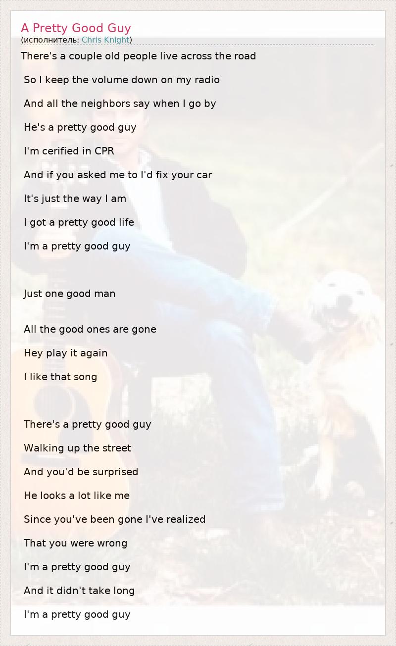 There's a couple old people live across the road So I keep the volume down on my radio And all the neighbors say when I go by He's a pretty good guy I'm cerified in CPR And if you asked me to I'd fix your car It's just the way I am I got a pretty good life I'm a pretty good guy Just one good man All the good ones are gone Hey play it again I like that song There's a pretty good guy Walking up the street And you'd be surprised He looks a lot like me Since you've been gone I've realized That you were wrong I'm a pretty good guy And it didn't take long I'm a pretty good guy