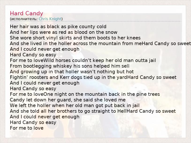 Her hair was as black as pike county cold And her lips were as red as blood on the snow She wore short vinyl skirts and them boots to her knees And she lived in the holler across the mountain from meHard Candy so sweet And I could never get enough Hard Candy so easy For me to loveWild horses couldn't keep her old man outta jail From bootlegging whiskey his sons helped him sell And growing up in that holler wasn't nothing but hot Fightin' roosters and Kerr dogs tied up in the yardHard Candy so sweet And I could never get enough Hard Candy so easy For me to loveOne night on the mountain back in the pine trees Candy let down her guard, she said she loved me We left the holler when her old man got put back in jail And she told all her brothers to go straight to HellHard Candy so sweet And I could never get enough Hard Candy so easy For me to love