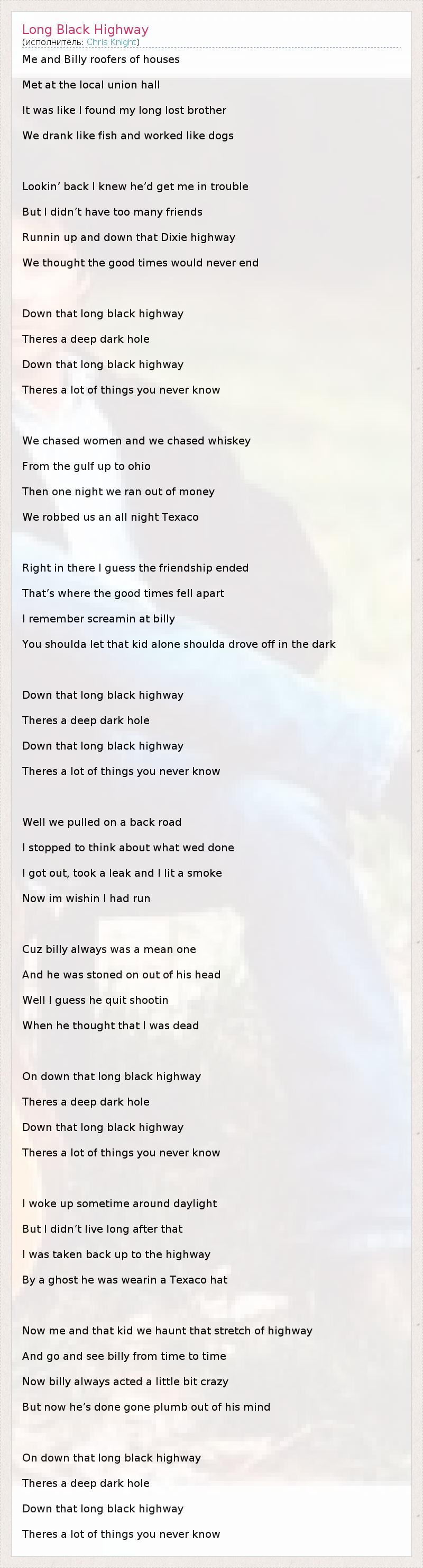 А как ты думаешь, о чем песня "Long Black Highway" ?