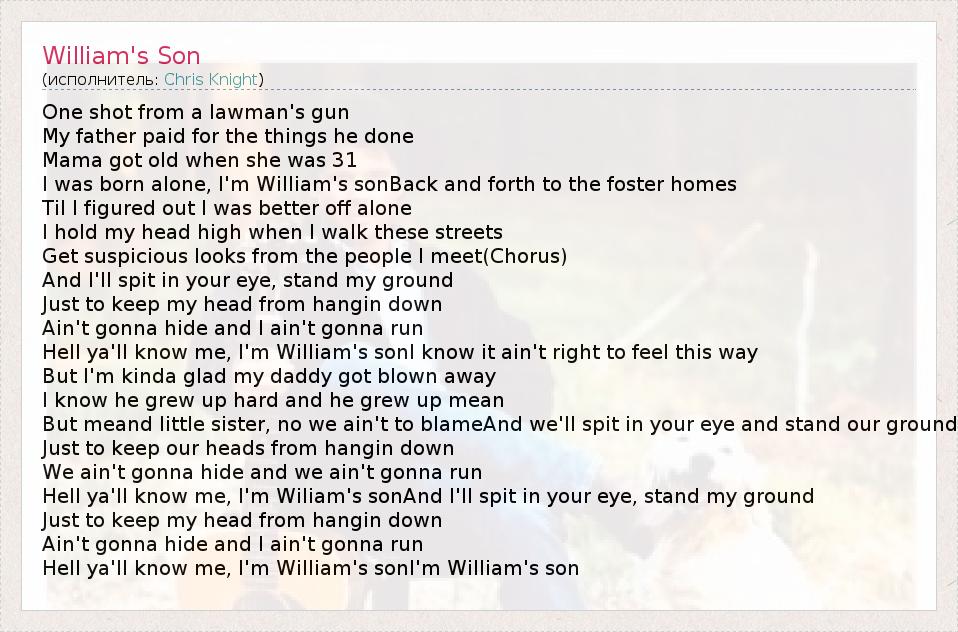 Hell ya'll know me, I'm Wiliam's sonAnd I'll spit in your eye, stand my ground