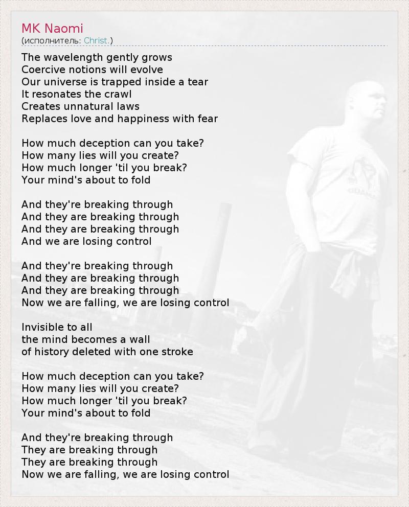 Длина волны постепенно увеличивается, Принудительные представления будут развиваться, Наша вселенная застряла в дыре, Она отражает медленное движение, Создает неестественные законы, Заменяет любовь и счастье на страх. Сколько обмана ты можешь стерпеть? Сколько ты выдумаешь лжи? Сколько еще продержишься и не сломаешься? Твое сознание на грани краха. А они прорываются, А они прорываются, А они прорываются, А мы теряем контроль. А они прорываются, А они прорываются, А они прорываются, А мы теперь падаем и теряем контроль. Невидимое для всех, Сознание становится стеной Истории, уничтоженной одним ударом. Сколько обмана ты можешь стерпеть? Сколько ты выдумаешь лжи? Сколько еще продержишься и не сломаешься? Твое сознание на грани краха. А они прорываются, А они прорываются, А они прорываются, А мы теперь падаем и теряем контроль. 1 - Проект МК-ULTRA — кодовое название секретной программы американского ЦРУ , имевшей целью поиск и изучение средств манипулирования сознанием , например, для вербовки агентов или для извлечения информации на допросах, в частности, с помощью использования психотропных химических веществ (оказывающих воздействие на сознание человека).