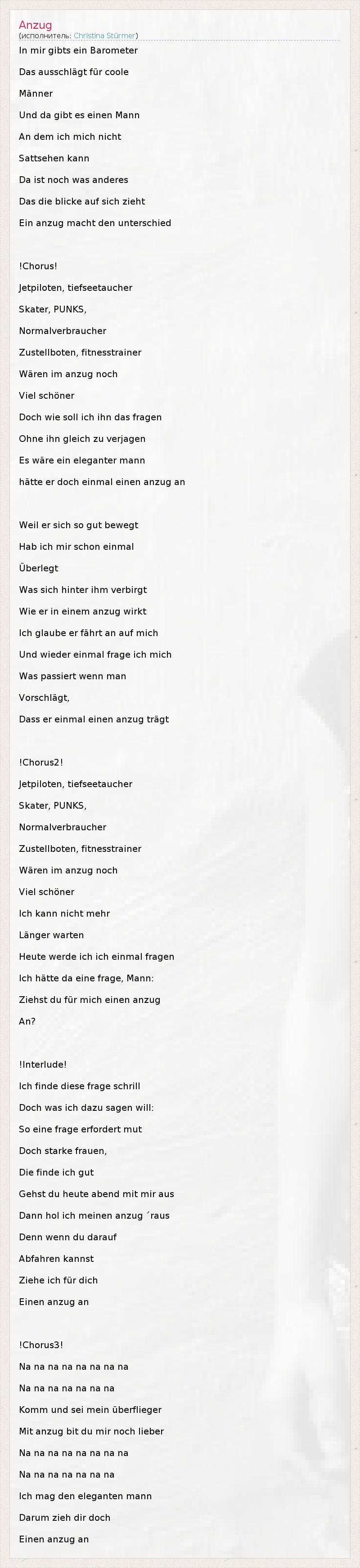 Это интересно:Эта миловидная брюнетка, подобно штурму, ворвалась в австрийские, немецкие и швейцарские хит-парады, ее концерты собирают тысячи поклонников, радиостанции с удовольствием крутят ее песни, и она очень комфортно чувствует себя в новой роли – в роли звезды, так как больше всего в этой жизни любит музыку. А еще ей нравится кино, хороший кофе, пицца, водка и Паоло Коэльо. Кристина Штюрмер является... продолжение