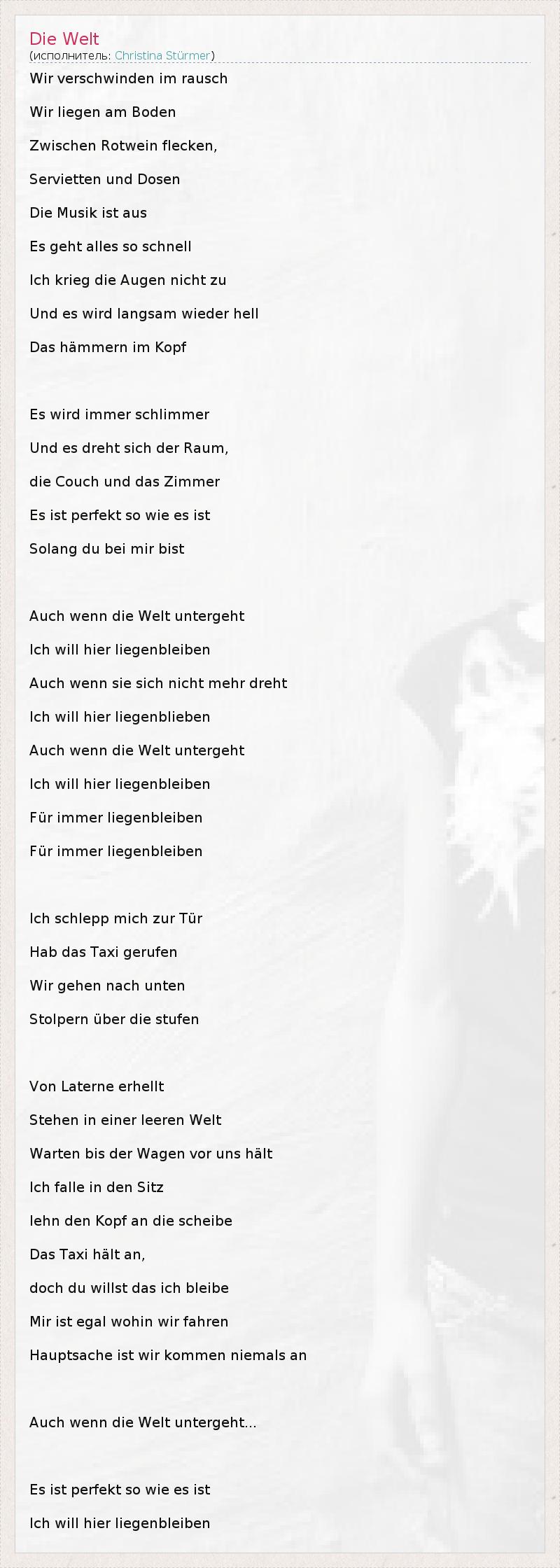 Это интересно:Эта миловидная брюнетка, подобно штурму, ворвалась в австрийские, немецкие и швейцарские хит-парады, ее концерты собирают тысячи поклонников, радиостанции с удовольствием крутят ее песни, и она очень комфортно чувствует себя в новой роли – в роли звезды, так как больше всего в этой жизни любит музыку. А еще ей нравится кино, хороший кофе, пицца, водка и Паоло Коэльо. Кристина Штюрмер является... продолжение