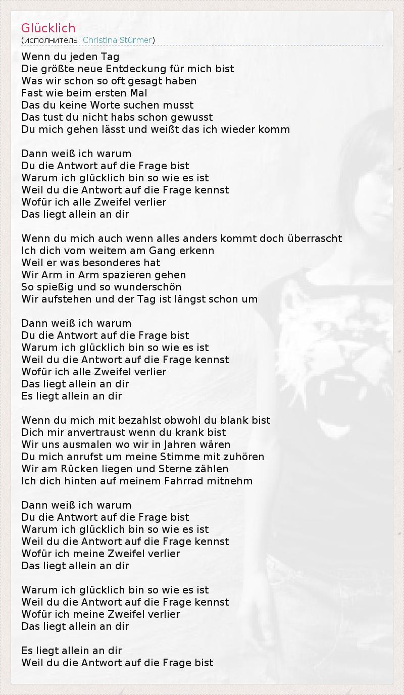 Это интересно:Эта миловидная брюнетка, подобно штурму, ворвалась в австрийские, немецкие и швейцарские хит-парады, ее концерты собирают тысячи поклонников, радиостанции с удовольствием крутят ее песни, и она очень комфортно чувствует себя в новой роли – в роли звезды, так как больше всего в этой жизни любит музыку. А еще ей нравится кино, хороший кофе, пицца, водка и Паоло Коэльо. Кристина Штюрмер является... продолжение