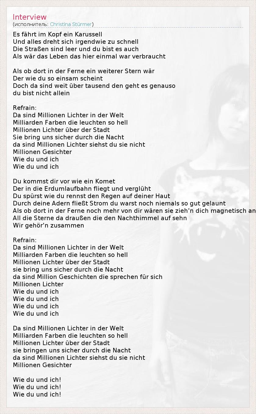 Es fährt im Kopf ein Karussell Und alles dreht sich irgendwie zu schnell Die Straßen sind leer und du bist es auch Als wär das Leben das hier einmal war verbraucht Als ob dort in der Ferne ein weiterer Stern wär Der wie du so einsam scheint Doch da sind weit über tausend den geht es genauso du bist nicht allein Refrain: Da sind Millionen Lichter in der Welt Milliarden Farben die leuchten so hell Millionen Lichter über der Stadt Sie bring uns sicher durch die Nacht da sind Millionen Lichter siehst du sie nicht Millionen Gesichter Wie du und ich Wie du und ich Du kommst dir vor wie ein Komet Der in die Erdumlaufbahn fliegt und verglüht Du spürst wie du rennst den Regen auf deiner Haut Durch deine Adern fließt Strom du warst noch niemals so gut gelaunt Als ob dort in der Ferne noch mehr von dir wären sie zieh'n dich magnetisch an All die Sterne da draußen die den Nachthimmel auf sehn Wir gehör'n zusammen Refrain: Da sind Millionen Lichter in der Welt Milliarden Farben die leuchten so hell Millionen Lichter über der Stadt sie bring uns sicher durch die Nacht da sind Million Geschichten die sprechen für sich Millionen Lichter Wie du und ich Wie du und ich Wie du und ich Wie du und ich Da sind Millionen Lichter in der Welt Milliarden Farben die leuchten so hell Millionen Lichter über der Stadt sie bringen uns sicher durch die Nacht da sind Millionen Lichter siehst du sie nicht Millionen Gesichter Wie du und ich! Wie du und ich! Wie du und ich!