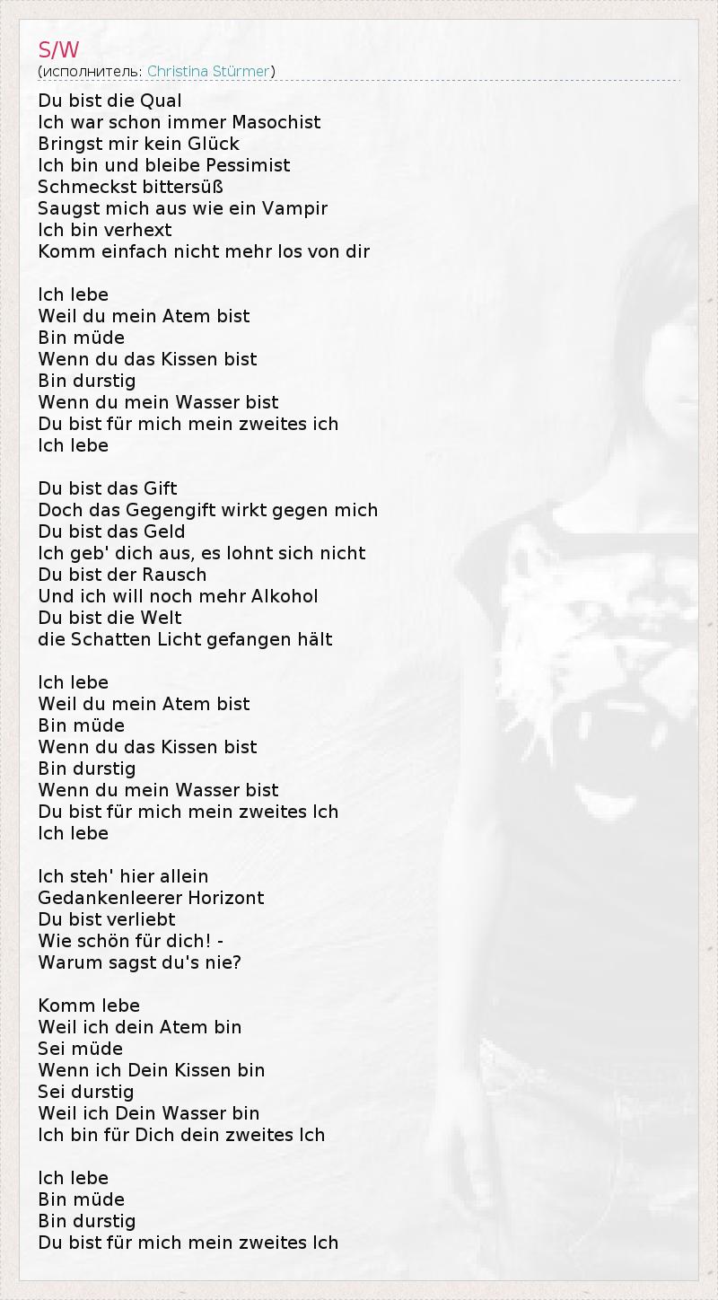 Du bist die Qual Ich war schon immer Masochist Bringst mir kein Glück Ich bin und bleibe Pessimist Schmeckst bittersüß Saugst mich aus wie ein Vampir Ich bin verhext Komm einfach nicht mehr los von dir Ich lebe Weil du mein Atem bist Bin müde Wenn du das Kissen bist Bin durstig Wenn du mein Wasser bist Du bist für mich mein zweites ich Ich lebe Du bist das Gift Doch das Gegengift wirkt gegen mich Du bist das Geld Ich geb' dich aus, es lohnt sich nicht Du bist der Rausch Und ich will noch mehr Alkohol Du bist die Welt die Schatten Licht gefangen hält Ich lebe Weil du mein Atem bist Bin müde Wenn du das Kissen bist Bin durstig Wenn du mein Wasser bist Du bist für mich mein zweites Ich Ich lebe Ich steh' hier allein Gedankenleerer Horizont Du bist verliebt Wie schön für dich! - Warum sagst du's nie? Komm lebe Weil ich dein Atem bin Sei müde Wenn ich Dein Kissen bin Sei durstig Weil ich Dein Wasser bin Ich bin für Dich dein zweites Ich Ich lebe Bin müde Bin durstig Du bist für mich mein zweites Ich