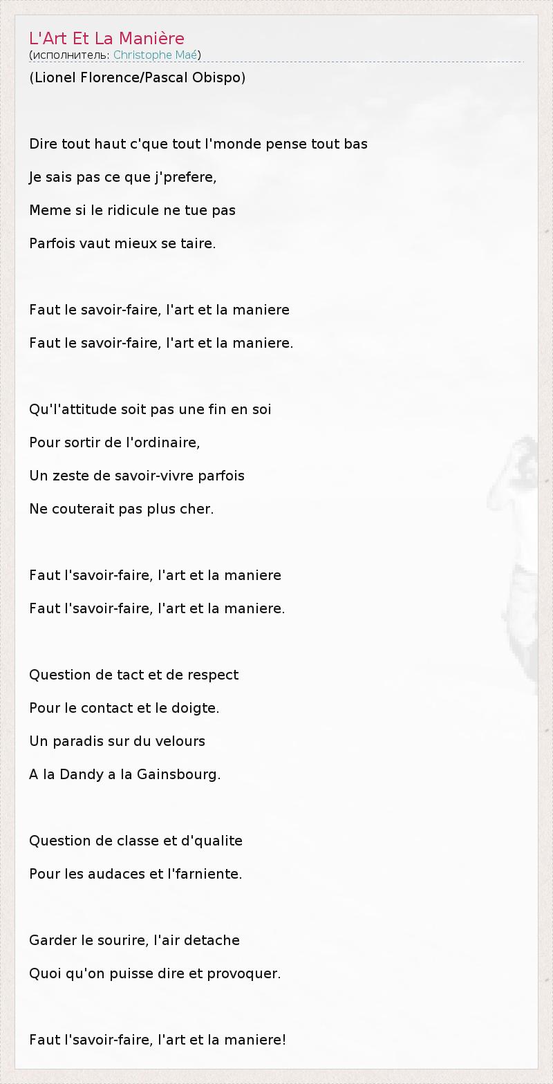 (Lionel Florence/Pascal Obispo) Dire tout haut c'que tout l'monde pense tout bas Je sais pas ce que j'prefere, Meme si le ridicule ne tue pas Parfois vaut mieux se taire. Faut le savoir-faire, l'art et la maniere Faut le savoir-faire, l'art et la maniere. Qu'l'attitude soit pas une fin en soi Pour sortir de l'ordinaire, Un zeste de savoir-vivre parfois Ne couterait pas plus cher. Faut l'savoir-faire, l'art et la maniere Faut l'savoir-faire, l'art et la maniere. Question de tact et de respect Pour le contact et le doigte. Un paradis sur du velours A la Dandy a la Gainsbourg. Question de classe et d'qualite Pour les audaces et l'farniente. Garder le sourire, l'air detache Quoi qu'on puisse dire et provoquer. Faut l'savoir-faire, l'art et la maniere!