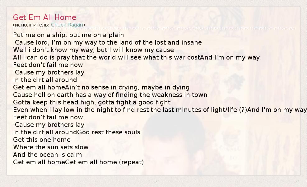 Put me on a ship, put me on a plain 'Cause lord, I'm on my way to the land of the lost and insane Well i don't know my way, but I will know my cause All I can do is pray that the world will see what this war costAnd I'm on my way Feet don't fail me now 'Cause my brothers lay in the dirt all around Get em all homeAin't no sense in crying, maybe in dying Cause hell on earth has a way of finding the weakness in town Gotta keep this head high, gotta fight a good fight Even when i lay low in the night to find rest the last minutes of light/life (?)And I'm on my way Feet don't fail me now 'Cause my brothers lay in the dirt all aroundGod rest these souls Get this one home Where the sun sets slow And the ocean is calm Get em all homeGet em all home (repeat)
