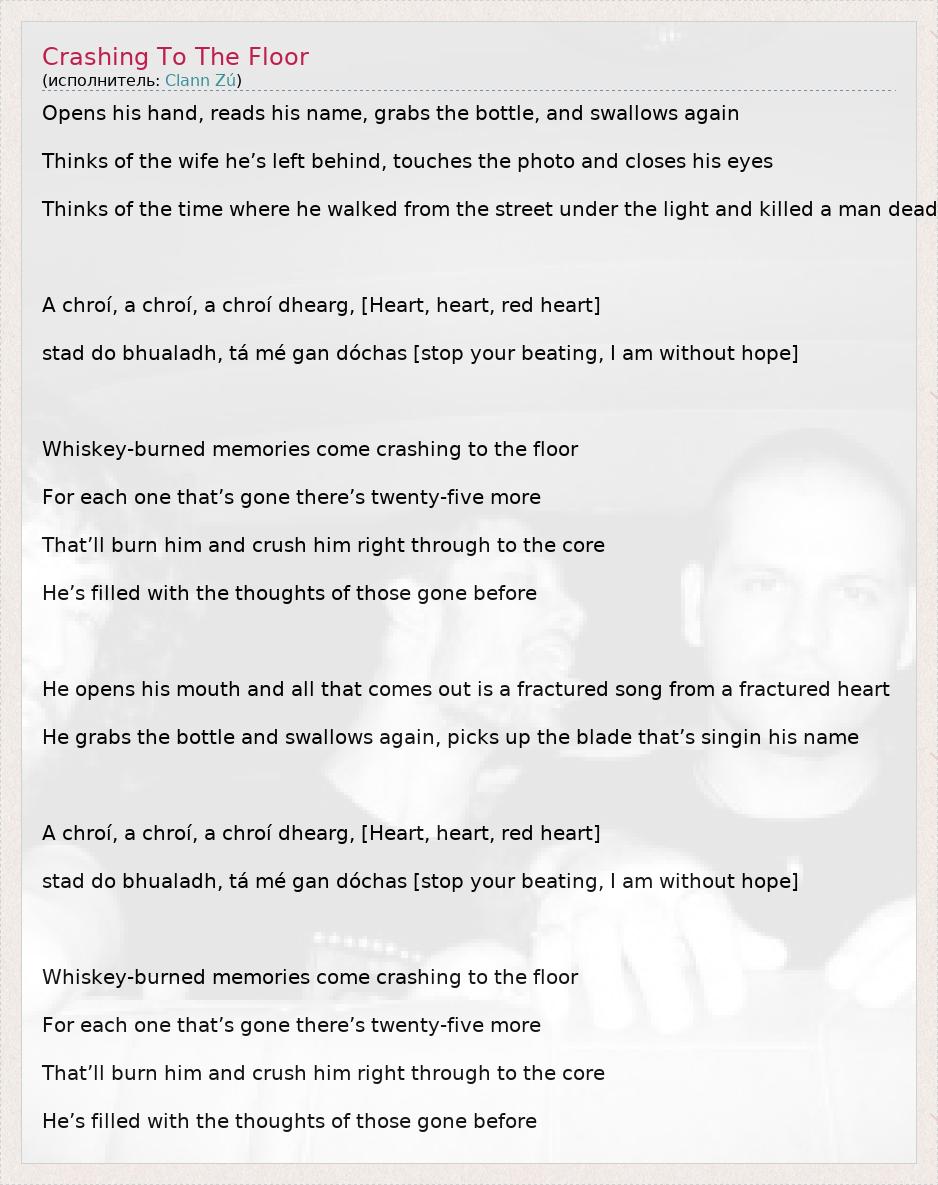 Opens his hand, reads his name, grabs the bottle, and swallows again Thinks of the wife he’s left behind, touches the photo and closes his eyes Thinks of the time where he walked from the street under the light and killed a man dead A chroí, a chroí, a chroí dhearg, [Heart, heart, red heart] stad do bhualadh, tá mé gan dóchas [stop your beating, I am without hope] Whiskey-burned memories come crashing to the floor For each one that’s gone there’s twenty-five more That’ll burn him and crush him right through to the core He’s filled with the thoughts of those gone before He opens his mouth and all that comes out is a fractured song from a fractured heart He grabs the bottle and swallows again, picks up the blade that’s singin his name A chroí, a chroí, a chroí dhearg, [Heart, heart, red heart] stad do bhualadh, tá mé gan dóchas [stop your beating, I am without hope] Whiskey-burned memories come crashing to the floor For each one that’s gone there’s twenty-five more That’ll burn him and crush him right through to the core He’s filled with the thoughts of those gone before