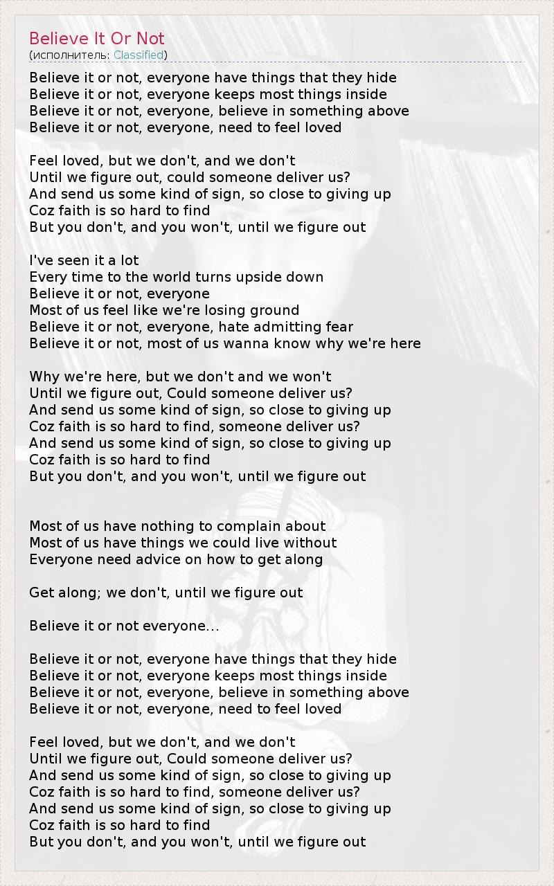 Веришь или нет. Веришь или нет, каждому из нас есть что скрывать. Веришь или нет, каждый из нас держит большинство мыслей в себе. Веришь или нет, каждый из нас верит во что-то высшее. Веришь или нет, каждому из нас необходимо чувствовать себя любимым. Чувствовать себя любимым, но этого не случится, нет, Пока мы не разберемся в себе, сможет ли кто-то освободить нас? И послать нам что-то вроде знака, когда мы так близки к тому, чтобы сдаться... Потому что веру так сложно найти! Но мы даже не ищем, и не найдём до тех пор, пока не разберемся в себе... Я видел это достаточно часто, Каждый раз, когда весь мир переворачивался, Веришь или нет, каждый раз Большинство из нас чувствуют себя потерянными... Веришь или нет, каждый из нас ненавидит чувствовать страх. Веришь или нет, каждый из нас хочет знать, зачем мы здесь.... Зачем мы здесь, но мы не знаем, нет, Пока не разберемся в себе, сможет ли кто-то освободить нас? И послать нам что-то вроде знака, когда мы так близки к тому, чтобы сдаться... Потому что веру так сложно найти! И послать нам что-то вроде знака, когда мы так близки к тому, чтобы сдаться... Потому что веру так сложно найти! Но мы даже не ищем, и не найдём до тех пор, пока не разберемся в себе... Большинству из нас не на что жаловаться. У большинства из нас есть вещи, без которых мы не представляем нашей жизни. Каждому нужен совет, как преуспеть во всём... Преуспеть во всём, но этого не случится, пока не разберемся в себе... Веришь или нет, каждый из нас... Веришь или нет, каждому из нас есть что скрывать. Веришь или нет, каждый из нас держит большинство мыслей в себе. Веришь или нет, каждый из нас верит во что-то высшее. Веришь или нет, каждому из нас необходимо чувствовать себя любимым. Чувствовать себя любимым, но этого не случится, нет, Пока мы не разберемся в себе, сможет ли кто-то освободить нас? И послать нам что-то вроде знака, когда мы так близки к тому, чтобы сдаться... Потому что веру так сложно найти! И послать нам что-то вроде знака, когда мы так близки к тому, чтобы сдаться... Потому что веру так сложно найти! Но мы даже не ищем, и не найдём до тех пор, пока не разберемся в себе...