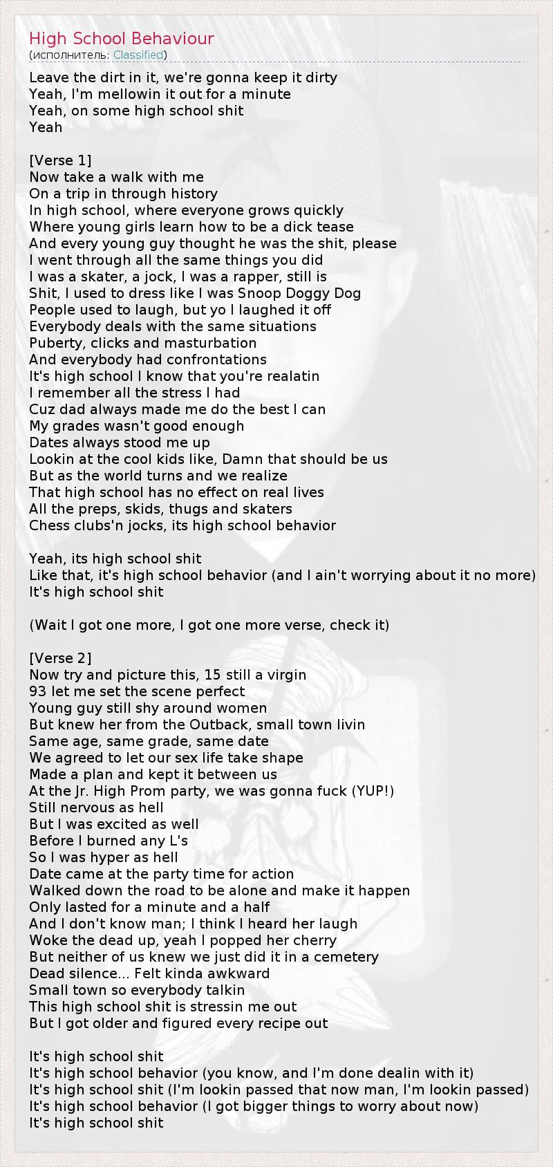 Leave the dirt in it, we're gonna keep it dirty Yeah, I'm mellowin it out for a minute Yeah, on some high school shit Yeah [Verse 1] Now take a walk with me On a trip in through history In high school, where everyone grows quickly Where young girls learn how to be a dick tease And every young guy thought he was the shit, please I went through all the same things you did I was a skater, a jock, I was a rapper, still is Shit, I used to dress like I was Snoop Doggy Dog People used to laugh, but yo I laughed it off Everybody deals with the same situations Puberty, clicks and masturbation And everybody had confrontations It's high school I know that you're realatin I remember all the stress I had Cuz dad always made me do the best I can My grades wasn't good enough Dates always stood me up Lookin at the cool kids like, Damn that should be us But as the world turns and we realize That high school has no effect on real lives All the preps, skids, thugs and skaters Chess clubs'n jocks, its high school behavior Yeah, its high school shit Like that, it's high school behavior (and I ain't worrying about it no more) It's high school shit (Wait I got one more, I got one more verse, check it) [Verse 2] Now try and picture this, 15 still a virgin 93 let me set the scene perfect Young guy still shy around women But knew her from the Outback, small town livin Same age, same grade, same date We agreed to let our sex life take shape Made a plan and kept it between us At the Jr. High Prom party, we was gonna fuck (YUP!) Still nervous as hell But I was excited as well Before I burned any L's So I was hyper as hell Date came at the party time for action Walked down the road to be alone and make it happen Only lasted for a minute and a half And I don't know man; I think I heard her laugh Woke the dead up, yeah I popped her cherry But neither of us knew we just did it in a cemetery Dead silence... Felt kinda awkward Small town so everybody talkin This high school shit is stressin me out But I got older and figured every recipe out It's high school shit It's high school behavior (you know, and I'm done dealin with it) It's high school shit (I'm lookin passed that now man, I'm lookin passed) It's high school behavior (I got bigger things to worry about now) It's high school shit