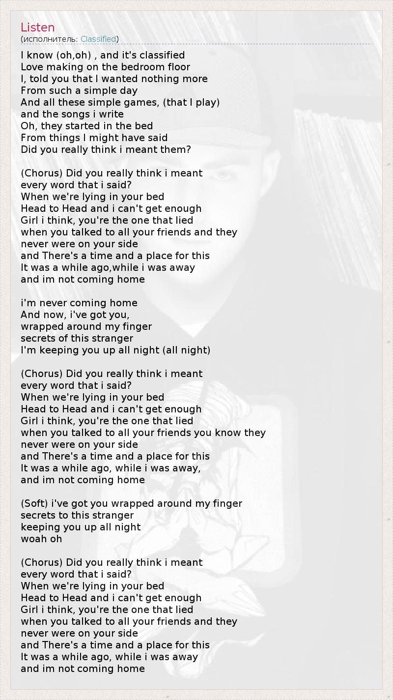 I know (oh,oh) , and it's classified Love making on the bedroom floor I, told you that I wanted nothing more From such a simple day And all these simple games, (that I play) and the songs i write Oh, they started in the bed From things I might have said Did you really think i meant them? (Chorus) Did you really think i meant every word that i said? When we're lying in your bed Head to Head and i can't get enough Girl i think, you're the one that lied when you talked to all your friends and they never were on your side and There's a time and a place for this It was a while ago,while i was away and im not coming home i'm never coming home And now, i've got you, wrapped around my finger secrets of this stranger I'm keeping you up all night (all night) (Chorus) Did you really think i meant every word that i said? When we're lying in your bed Head to Head and i can't get enough Girl i think, you're the one that lied when you talked to all your friends you know they never were on your side and There's a time and a place for this It was a while ago, while i was away, and im not coming home (Soft) i've got you wrapped around my finger secrets to this stranger keeping you up all night woah oh (Chorus) Did you really think i meant every word that i said? When we're lying in your bed Head to Head and i can't get enough Girl i think, you're the one that lied when you talked to all your friends and they never were on your side and There's a time and a place for this It was a while ago, while i was away and im not coming home