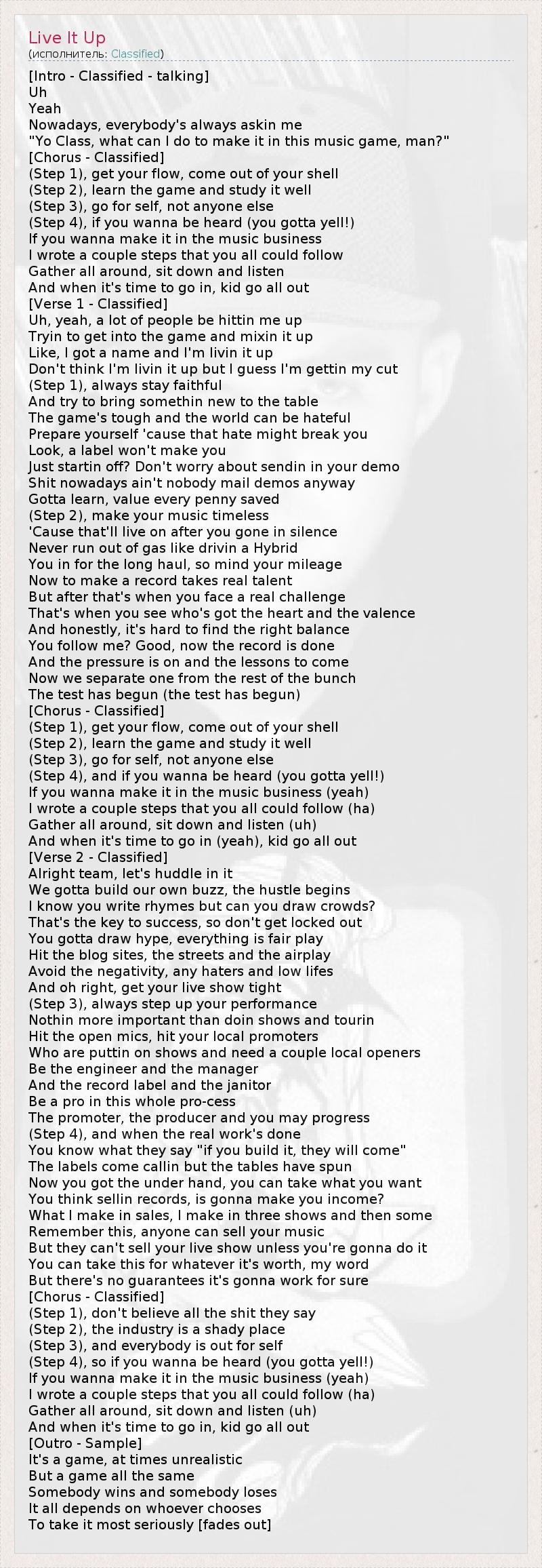 [Intro - Classified - talking] Uh Yeah Nowadays, everybody's always askin me "Yo Class, what can I do to make it in this music game, man?" [Chorus - Classified] (Step 1), get your flow, come out of your shell (Step 2), learn the game and study it well (Step 3), go for self, not anyone else (Step 4), if you wanna be heard (you gotta yell!) If you wanna make it in the music business I wrote a couple steps that you all could follow Gather all around, sit down and listen And when it's time to go in, kid go all out [Verse 1 - Classified] Uh, yeah, a lot of people be hittin me up Tryin to get into the game and mixin it up Like, I got a name and I'm livin it up Don't think I'm livin it up but I guess I'm gettin my cut (Step 1), always stay faithful And try to bring somethin new to the table The game's tough and the world can be hateful Prepare yourself 'cause that hate might break you Look, a label won't make you Just startin off? Don't worry about sendin in your demo Shit nowadays ain't nobody mail demos anyway Gotta learn, value every penny saved (Step 2), make your music timeless 'Cause that'll live on after you gone in silence Never run out of gas like drivin a Hybrid You in for the long haul, so mind your mileage Now to make a record takes real talent But after that's when you face a real challenge That's when you see who's got the heart and the valence And honestly, it's hard to find the right balance You follow me? Good, now the record is done And the pressure is on and the lessons to come Now we separate one from the rest of the bunch The test has begun (the test has begun) [Chorus - Classified] (Step 1), get your flow, come out of your shell (Step 2), learn the game and study it well (Step 3), go for self, not anyone else (Step 4), and if you wanna be heard (you gotta yell!) If you wanna make it in the music business (yeah) I wrote a couple steps that you all could follow (ha) Gather all around, sit down and listen (uh) And when it's time to go in (yeah), kid go all out [Verse 2 - Classified] Alright team, let's huddle in it We gotta build our own buzz, the hustle begins I know you write rhymes but can you draw crowds? That's the key to success, so don't get locked out You gotta draw hype, everything is fair play Hit the blog sites, the streets and the airplay Avoid the negativity, any haters and low lifes And oh right, get your live show tight (Step 3), always step up your performance Nothin more important than doin shows and tourin Hit the open mics, hit your local promoters Who are puttin on shows and need a couple local openers Be the engineer and the manager And the record label and the janitor Be a pro in this whole pro-cess The promoter, the producer and you may progress (Step 4), and when the real work's done You know what they say "if you build it, they will come" The labels come callin but the tables have spun Now you got the under hand, you can take what you want You think sellin records, is gonna make you income? What I make in sales, I make in three shows and then some Remember this, anyone can sell your music But they can't sell your live show unless you're gonna do it You can take this for whatever it's worth, my word But there's no guarantees it's gonna work for sure [Chorus - Classified] (Step 1), don't believe all the shit they say (Step 2), the industry is a shady place (Step 3), and everybody is out for self (Step 4), so if you wanna be heard (you gotta yell!) If you wanna make it in the music business (yeah) I wrote a couple steps that you all could follow (ha) Gather all around, sit down and listen (uh) And when it's time to go in, kid go all out [Outro - Sample] It's a game, at times unrealistic But a game all the same Somebody wins and somebody loses It all depends on whoever chooses To take it most seriously [fades out]