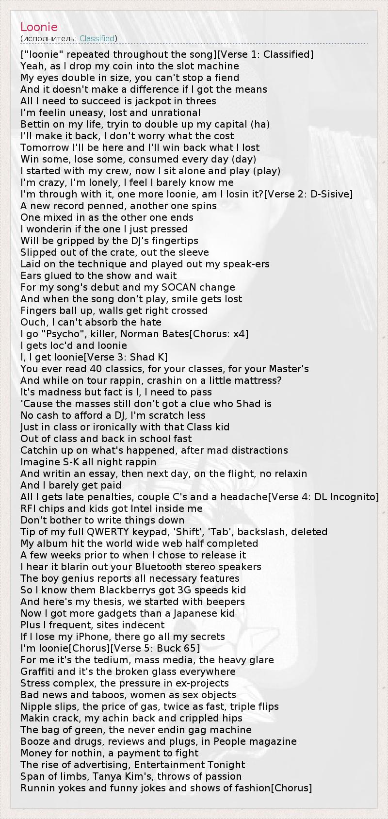 ["loonie" repeated throughout the song][Verse 1: Classified] Yeah, as I drop my coin into the slot machine My eyes double in size, you can't stop a fiend And it doesn't make a difference if I got the means All I need to succeed is jackpot in threes I'm feelin uneasy, lost and unrational Bettin on my life, tryin to double up my capital (ha) I'll make it back, I don't worry what the cost Tomorrow I'll be here and I'll win back what I lost Win some, lose some, consumed every day (day) I started with my crew, now I sit alone and play (play) I'm crazy, I'm lonely, I feel I barely know me I'm through with it, one more loonie, am I losin it?[Verse 2: D-Sisive] A new record penned, another one spins One mixed in as the other one ends I wonderin if the one I just pressed Will be gripped by the DJ's fingertips Slipped out of the crate, out the sleeve Laid on the technique and played out my speak-ers Ears glued to the show and wait For my song's debut and my SOCAN change And when the song don't play, smile gets lost Fingers ball up, walls get right crossed Ouch, I can't absorb the hate I go "Psycho", killer, Norman Bates[Chorus: x4] I gets loc'd and loonie I, I get loonie[Verse 3: Shad K] You ever read 40 classics, for your classes, for your Master's And while on tour rappin, crashin on a little mattress? It's madness but fact is I, I need to pass 'Cause the masses still don't got a clue who Shad is No cash to afford a DJ, I'm scratch less Just in class or ironically with that Class kid Out of class and back in school fast Catchin up on what's happened, after mad distractions Imagine S-K all night rappin And writin an essay, then next day, on the flight, no relaxin And I barely get paid All I gets late penalties, couple C's and a headache[Verse 4: DL Incognito] RFI chips and kids got Intel inside me Don't bother to write things down Tip of my full QWERTY keypad, 'Shift', 'Tab', backslash, deleted My album hit the world wide web half completed A few weeks prior to when I chose to release it I hear it blarin out your Bluetooth stereo speakers The boy genius reports all necessary features So I know them Blackberrys got 3G speeds kid And here's my thesis, we started with beepers Now I got more gadgets than a Japanese kid Plus I frequent, sites indecent If I lose my iPhone, there go all my secrets I'm loonie[Chorus][Verse 5: Buck 65] For me it's the tedium, mass media, the heavy glare Graffiti and it's the broken glass everywhere Stress complex, the pressure in ex-projects Bad news and taboos, women as sex objects Nipple slips, the price of gas, twice as fast, triple flips Makin crack, my achin back and crippled hips The bag of green, the never endin gag machine Booze and drugs, reviews and plugs, in People magazine Money for nothin, a payment to fight The rise of advertising, Entertainment Tonight Span of limbs, Tanya Kim's, throws of passion Runnin yokes and funny jokes and shows of fashion[Chorus]