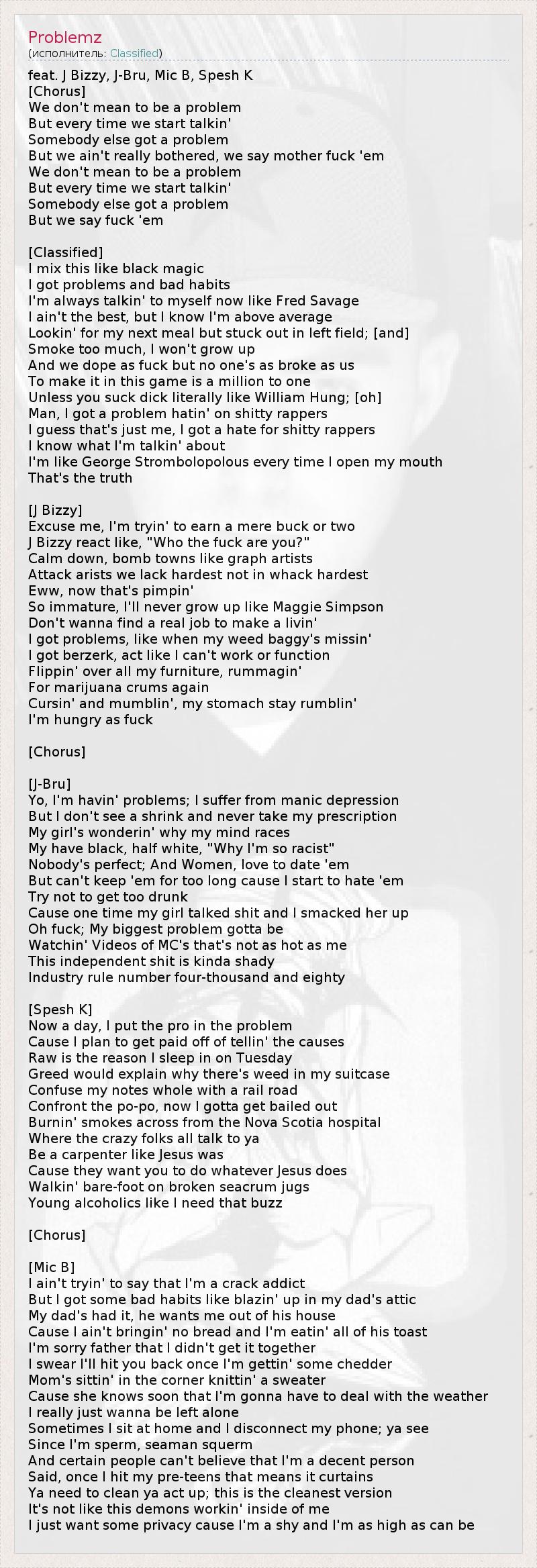 feat. J Bizzy, J-Bru, Mic B, Spesh K [Chorus] We don't mean to be a problem But every time we start talkin' Somebody else got a problem But we ain't really bothered, we say mother fuck 'em We don't mean to be a problem But every time we start talkin' Somebody else got a problem But we say fuck 'em [Classified] I mix this like black magic I got problems and bad habits I'm always talkin' to myself now like Fred Savage I ain't the best, but I know I'm above average Lookin' for my next meal but stuck out in left field; [and] Smoke too much, I won't grow up And we dope as fuck but no one's as broke as us To make it in this game is a million to one Unless you suck dick literally like William Hung; [oh] Man, I got a problem hatin' on shitty rappers I guess that's just me, I got a hate for shitty rappers I know what I'm talkin' about I'm like George Strombolopolous every time I open my mouth That's the truth [J Bizzy] Excuse me, I'm tryin' to earn a mere buck or two J Bizzy react like, "Who the fuck are you?" Calm down, bomb towns like graph artists Attack arists we lack hardest not in whack hardest Eww, now that's pimpin' So immature, I'll never grow up like Maggie Simpson Don't wanna find a real job to make a livin' I got problems, like when my weed baggy's missin' I got berzerk, act like I can't work or function Flippin' over all my furniture, rummagin' For marijuana crums again Cursin' and mumblin', my stomach stay rumblin' I'm hungry as fuck [Chorus] [J-Bru] Yo, I'm havin' problems; I suffer from manic depression But I don't see a shrink and never take my prescription My girl's wonderin' why my mind races My have black, half white, "Why I'm so racist" Nobody's perfect; And Women, love to date 'em But can't keep 'em for too long cause I start to hate 'em Try not to get too drunk Cause one time my girl talked shit and I smacked her up Oh fuck; My biggest problem gotta be Watchin' Videos of MC's that's not as hot as me This independent shit is kinda shady Industry rule number four-thousand and eighty [Spesh K] Now a day, I put the pro in the problem Cause I plan to get paid off of tellin' the causes Raw is the reason I sleep in on Tuesday Greed would explain why there's weed in my suitcase Confuse my notes whole with a rail road Confront the po-po, now I gotta get bailed out Burnin' smokes across from the Nova Scotia hospital Where the crazy folks all talk to ya Be a carpenter like Jesus was Cause they want you to do whatever Jesus does Walkin' bare-foot on broken seacrum jugs Young alcoholics like I need that buzz [Chorus] [Mic B] I ain't tryin' to say that I'm a crack addict But I got some bad habits like blazin' up in my dad's attic My dad's had it, he wants me out of his house Cause I ain't bringin' no bread and I'm eatin' all of his toast I'm sorry father that I didn't get it together I swear I'll hit you back once I'm gettin' some chedder Mom's sittin' in the corner knittin' a sweater Cause she knows soon that I'm gonna have to deal with the weather I really just wanna be left alone Sometimes I sit at home and I disconnect my phone; ya see Since I'm sperm, seaman squerm And certain people can't believe that I'm a decent person Said, once I hit my pre-teens that means it curtains Ya need to clean ya act up; this is the cleanest version It's not like this demons workin' inside of me I just want some privacy cause I'm a shy and I'm as high as can be