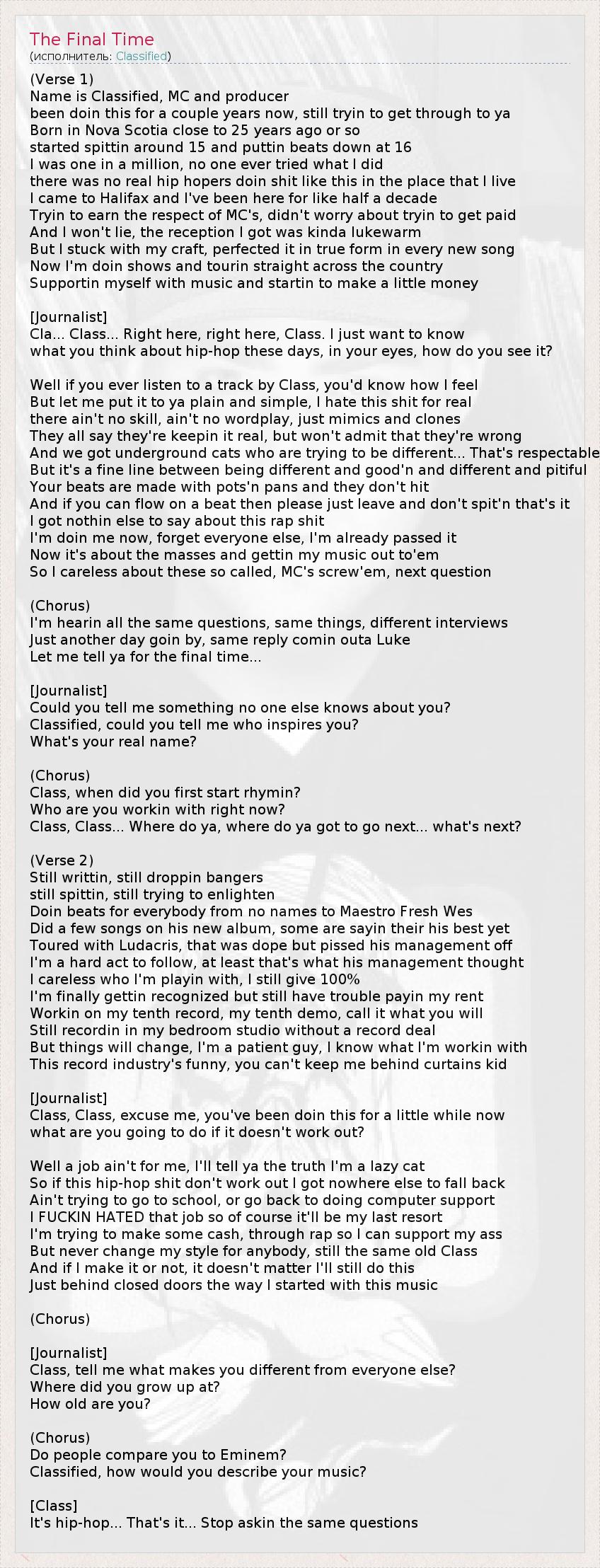(Verse 1) Name is Classified, MC and producer been doin this for a couple years now, still tryin to get through to ya Born in Nova Scotia close to 25 years ago or so started spittin around 15 and puttin beats down at 16 I was one in a million, no one ever tried what I did there was no real hip hopers doin shit like this in the place that I live I came to Halifax and I've been here for like half a decade Tryin to earn the respect of MC's, didn't worry about tryin to get paid And I won't lie, the reception I got was kinda lukewarm But I stuck with my craft, perfected it in true form in every new song Now I'm doin shows and tourin straight across the country Supportin myself with music and startin to make a little money [Journalist] Cla... Class... Right here, right here, Class. I just want to know what you think about hip-hop these days, in your eyes, how do you see it? Well if you ever listen to a track by Class, you'd know how I feel But let me put it to ya plain and simple, I hate this shit for real there ain't no skill, ain't no wordplay, just mimics and clones They all say they're keepin it real, but won't admit that they're wrong And we got underground cats who are trying to be different... That's respectable But it's a fine line between being different and good'n and different and pitiful Your beats are made with pots'n pans and they don't hit And if you can flow on a beat then please just leave and don't spit'n that's it I got nothin else to say about this rap shit I'm doin me now, forget everyone else, I'm already passed it Now it's about the masses and gettin my music out to'em So I careless about these so called, MC's screw'em, next question (Chorus) I'm hearin all the same questions, same things, different interviews Just another day goin by, same reply comin outa Luke Let me tell ya for the final time... [Journalist] Could you tell me something no one else knows about you? Classified, could you tell me who inspires you? What's your real name? (Chorus) Class, when did you first start rhymin? Who are you workin with right now? Class, Class... Where do ya, where do ya got to go next... what's next? (Verse 2) Still writtin, still droppin bangers still spittin, still trying to enlighten Doin beats for everybody from no names to Maestro Fresh Wes Did a few songs on his new album, some are sayin their his best yet Toured with Ludacris, that was dope but pissed his management off I'm a hard act to follow, at least that's what his management thought I careless who I'm playin with, I still give 100% I'm finally gettin recognized but still have trouble payin my rent Workin on my tenth record, my tenth demo, call it what you will Still recordin in my bedroom studio without a record deal But things will change, I'm a patient guy, I know what I'm workin with This record industry's funny, you can't keep me behind curtains kid [Journalist] Class, Class, excuse me, you've been doin this for a little while now what are you going to do if it doesn't work out? Well a job ain't for me, I'll tell ya the truth I'm a lazy cat So if this hip-hop shit don't work out I got nowhere else to fall back Ain't trying to go to school, or go back to doing computer support I FUCKIN HATED that job so of course it'll be my last resort I'm trying to make some cash, through rap so I can support my ass But never change my style for anybody, still the same old Class And if I make it or not, it doesn't matter I'll still do this Just behind closed doors the way I started with this music (Chorus) [Journalist] Class, tell me what makes you different from everyone else? Where did you grow up at? How old are you? (Chorus) Do people compare you to Eminem? Classified, how would you describe your music? [Class] It's hip-hop... That's it... Stop askin the same questions