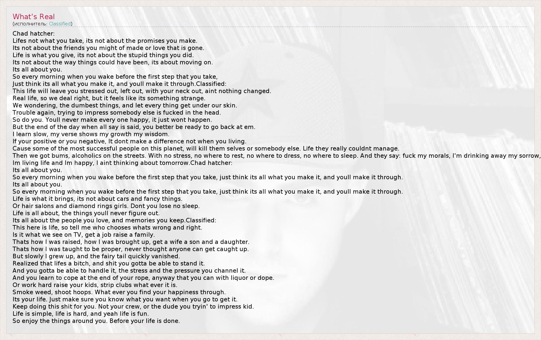 Chad hatcher: Lifes not what you take, its not about the promises you make. Its not about the friends you might of made or love that is gone. Life is what you give, its not about the stupid things you did. Its not about the way things could have been, its about moving on. Its all about you. So every morning when you wake before the first step that you take, Just think its all what you make it, and youll make it through.Classified: This life will leave you stressed out, left out, with your neck out, aint nothing changed. Real life, so we deal right, but it feels like its something strange. We wondering, the dumbest things, and let every thing get under our skin. Trouble again, trying to impress somebody else is fucked in the head. So do you. Youll never make every one happy, it just wont happen. But the end of the day when all say is said, you better be ready to go back at em. I learn slow, my verse shows my growth my wisdom. If your positive or you negative, It dont make a difference not when you living. Cause some of the most successful people on this planet, will kill them selves or somebody else. Life they really couldnt manage. Then we got bums, alcoholics on the streets. With no stress, no where to rest, no where to dress, no where to sleep. And they say: fuck my morals, I'm drinking away my sorrow, Im living life and Im happy, I aint thinking about tomorrow.Chad hatcher: Its all about you. So every morning when you wake before the first step that you take, just think its all what you make it, and youll make it through. Its all about you. So every morning when you wake before the first step that you take, just think its all what you make it, and youll make it through. Life is what it brings, its not about cars and fancy things. Or hair salons and diamond rings girls. Dont you lose no sleep. Life is all about, the things youll never figure out. Its all about the people you love, and memories you keep.Classified: This here is life, so tell me who chooses whats wrong and right. Is it what we see on TV, get a job raise a family. Thats how I was raised, how I was brought up, get a wife a son and a daughter. Thats how I was taught to be proper, never thought anyone can get caught up. But slowly I grew up, and the fairy tail quickly vanished. Realized that lifes a bitch, and shit you gotta be able to stand it. And you gotta be able to handle it, the stress and the pressure you channel it. And you learn to cope at the end of your rope, anyway that you can with liquor or dope. Or work hard raise your kids, strip clubs what ever it is. Smoke weed, shoot hoops. What ever you find your happiness through. Its your life. Just make sure you know what you want when you go to get it. Keep doing this shit for you. Not your crew, or the dude you tryin' to impress kid. Life is simple, life is hard, and yeah life is fun. So enjoy the things around you. Before your life is done.