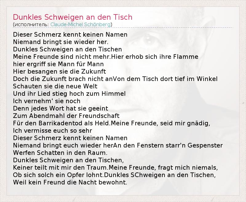 Dieser Schmerz kennt keinen Namen Niemand bringt sie wieder her. Dunkles Schweigen an den Tischen Meine Freunde sind nicht mehr.Hier erhob sich ihre Flamme hier ergriff sie Mann für Mann Hier besangen sie die Zukunft Doch die Zukunft brach nicht anVon dem Tisch dort tief im Winkel Schauten sie die neue Welt Und ihr Lied stieg hoch zum Himmel Ich vernehm' sie noch Denn jedes Wort hat sie geeint Zum Abendmahl der Freundschaft Für den Barrikadentod als Held.Meine Freunde, seid mir gnädig, Ich vermisse euch so sehr Dieser Schmerz kennt keinen Namen Niemand bringt euch wieder herAn den Fenstern starr'n Gespenster Werfen Schatten in den Raum. Dunkles Schweigen an den Tischen, Keiner teilt mit mir den Traum.Meine Freunde, fragt mich niemals, Ob sich solch ein Opfer lohnt.Dunkles SChweigen an den Tischen, Weil kein Freund die Nacht bewohnt.