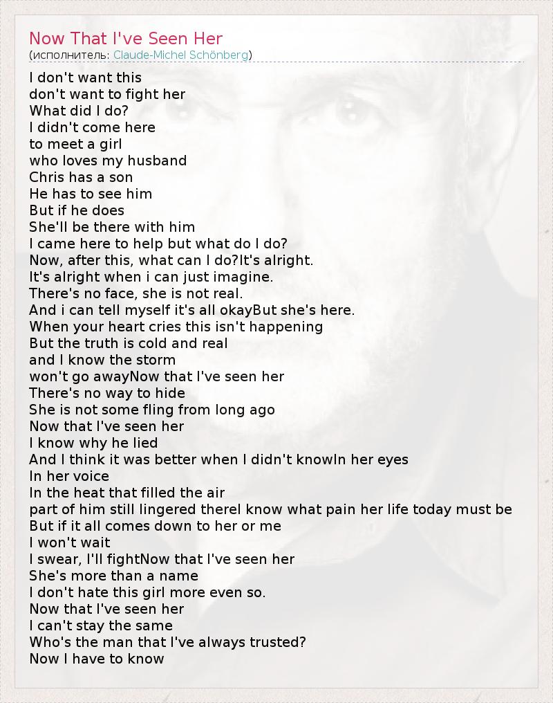 I don't want this don't want to fight her What did I do? I didn't come here to meet a girl who loves my husband Chris has a son He has to see him But if he does She'll be there with him I came here to help but what do I do? Now, after this, what can I do?It's alright. It's alright when i can just imagine. There's no face, she is not real. And i can tell myself it's all okayBut she's here. When your heart cries this isn't happening But the truth is cold and real and I know the storm won't go awayNow that I've seen her There's no way to hide She is not some fling from long ago Now that I've seen her I know why he lied And I think it was better when I didn't knowIn her eyes In her voice In the heat that filled the air part of him still lingered thereI know what pain her life today must be But if it all comes down to her or me I won't wait I swear, I'll fightNow that I've seen her She's more than a name I don't hate this girl more even so. Now that I've seen her I can't stay the same Who's the man that I've always trusted? Now I have to know