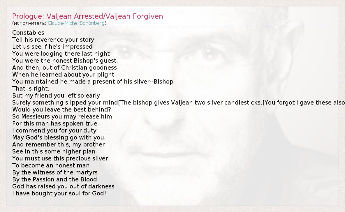 А как ты думаешь, о чем песня "Prologue: Valjean Arrested/Valjean Forgiven" ?