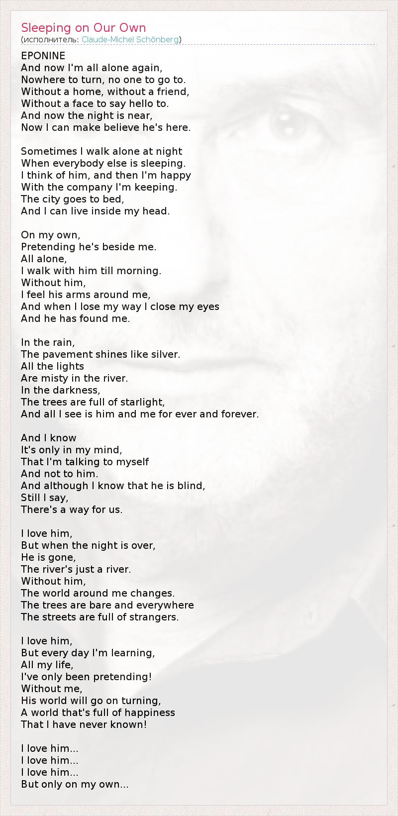 EPONINE And now I'm all alone again, Nowhere to turn, no one to go to. Without a home, without a friend, Without a face to say hello to. And now the night is near, Now I can make believe he's here. Sometimes I walk alone at night When everybody else is sleeping. I think of him, and then I'm happy With the company I'm keeping. The city goes to bed, And I can live inside my head. On my own, Pretending he's beside me. All alone, I walk with him till morning. Without him, I feel his arms around me, And when I lose my way I close my eyes And he has found me. In the rain, The pavement shines like silver. All the lights Are misty in the river. In the darkness, The trees are full of starlight, And all I see is him and me for ever and forever. And I know It's only in my mind, That I'm talking to myself And not to him. And although I know that he is blind, Still I say, There's a way for us. I love him, But when the night is over, He is gone, The river's just a river. Without him, The world around me changes. The trees are bare and everywhere The streets are full of strangers. I love him, But every day I'm learning, All my life, I've only been pretending! Without me, His world will go on turning, A world that's full of happiness That I have never known! I love him... I love him... I love him... But only on my own...