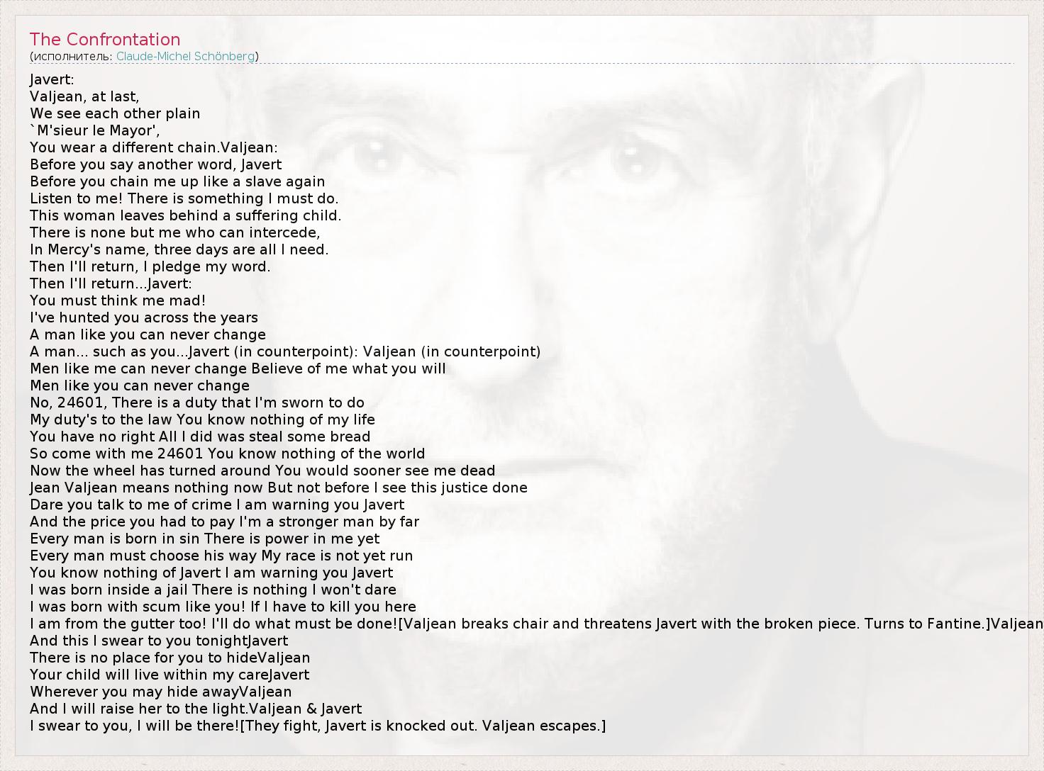 Javert: Valjean, at last, We see each other plain `M'sieur le Mayor', You wear a different chain.Valjean: Before you say another word, Javert Before you chain me up like a slave again Listen to me! There is something I must do. This woman leaves behind a suffering child. There is none but me who can intercede, In Mercy's name, three days are all I need. Then I'll return, I pledge my word. Then I'll return...Javert: You must think me mad! I've hunted you across the years A man like you can never change A man... such as you...Javert (in counterpoint): Valjean (in counterpoint) Men like me can never change Believe of me what you will Men like you can never change No, 24601, There is a duty that I'm sworn to do My duty's to the law You know nothing of my life You have no right All I did was steal some bread So come with me 24601 You know nothing of the world Now the wheel has turned around You would sooner see me dead Jean Valjean means nothing now But not before I see this justice done Dare you talk to me of crime I am warning you Javert And the price you had to pay I'm a stronger man by far Every man is born in sin There is power in me yet Every man must choose his way My race is not yet run You know nothing of Javert I am warning you Javert I was born inside a jail There is nothing I won't dare I was born with scum like you! If I have to kill you here I am from the gutter too! I'll do what must be done![Valjean breaks chair and threatens Javert with the broken piece. Turns to Fantine.]Valjean And this I swear to you tonightJavert There is no place for you to hideValjean Your child will live within my careJavert Wherever you may hide awayValjean And I will raise her to the light.Valjean & Javert I swear to you, I will be there![They fight, Javert is knocked out. Valjean escapes.]