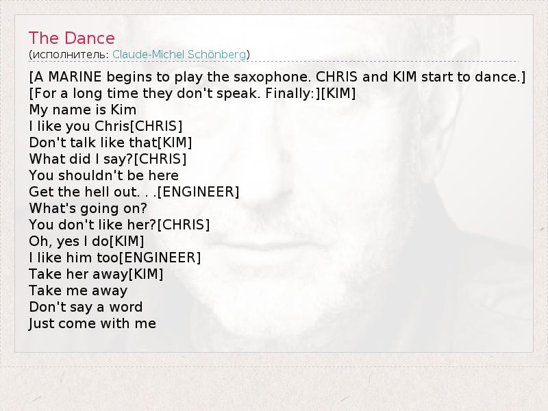 [A MARINE begins to play the saxophone. CHRIS and KIM start to dance.] [For a long time they don't speak. Finally:][KIM] My name is Kim I like you Chris[CHRIS] Don't talk like that[KIM] What did I say?[CHRIS] You shouldn't be here Get the hell out. . .[ENGINEER] What's going on? You don't like her?[CHRIS] Oh, yes I do[KIM] I like him too[ENGINEER] Take her away[KIM] Take me away Don't say a word Just come with me