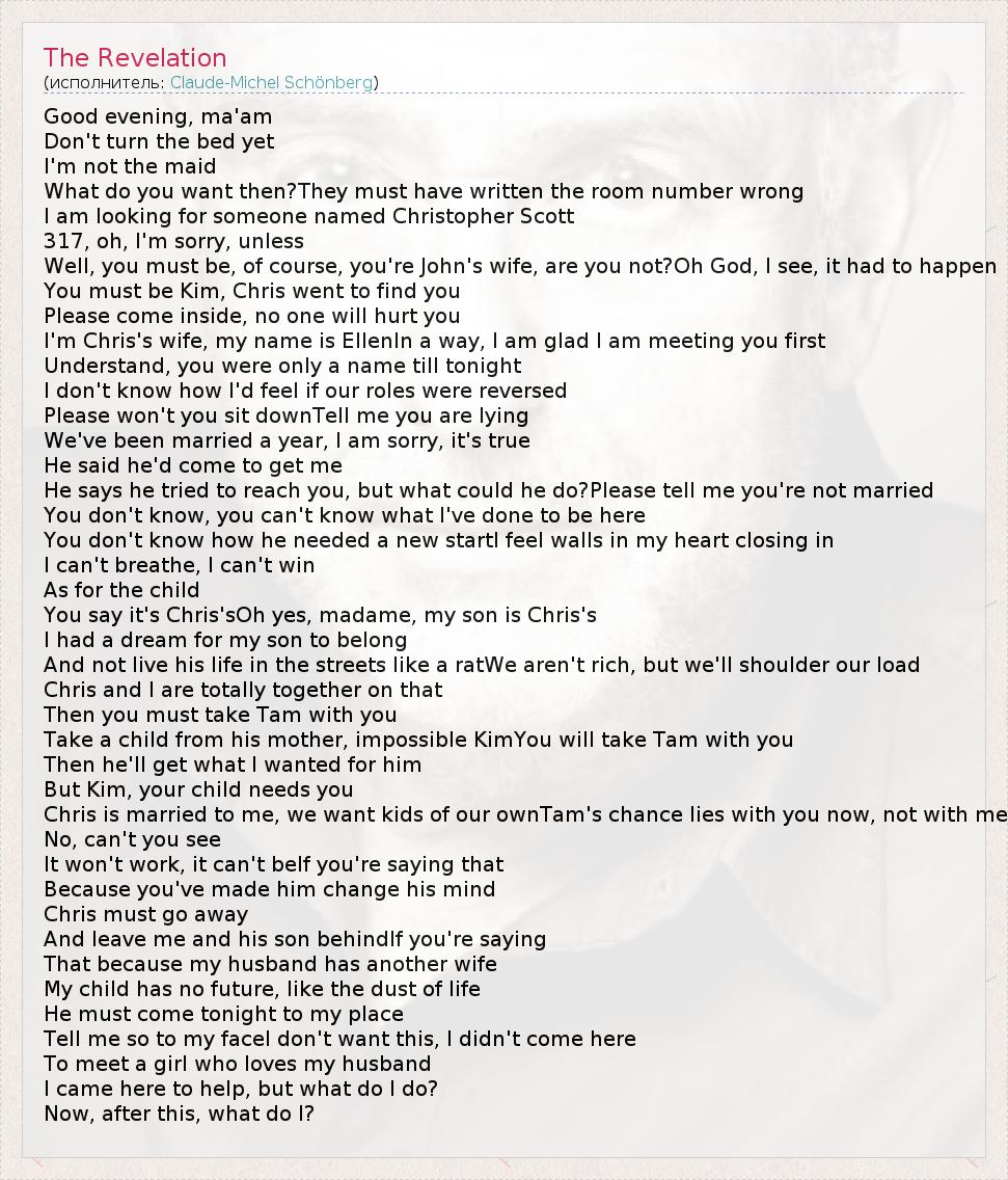 Good evening, ma'am Don't turn the bed yet I'm not the maid What do you want then?They must have written the room number wrong I am looking for someone named Christopher Scott 317, oh, I'm sorry, unless Well, you must be, of course, you're John's wife, are you not?Oh God, I see, it had to happen You must be Kim, Chris went to find you Please come inside, no one will hurt you I'm Chris's wife, my name is EllenIn a way, I am glad I am meeting you first Understand, you were only a name till tonight I don't know how I'd feel if our roles were reversed Please won't you sit downTell me you are lying We've been married a year, I am sorry, it's true He said he'd come to get me He says he tried to reach you, but what could he do?Please tell me you're not married You don't know, you can't know what I've done to be here You don't know how he needed a new startI feel walls in my heart closing in I can't breathe, I can't win As for the child You say it's Chris'sOh yes, madame, my son is Chris's I had a dream for my son to belong And not live his life in the streets like a ratWe aren't rich, but we'll shoulder our load Chris and I are totally together on that Then you must take Tam with you Take a child from his mother, impossible KimYou will take Tam with you Then he'll get what I wanted for him But Kim, your child needs you Chris is married to me, we want kids of our ownTam's chance lies with you now, not with me No, can't you see It won't work, it can't beIf you're saying that Because you've made him change his mind Chris must go away And leave me and his son behindIf you're saying That because my husband has another wife My child has no future, like the dust of life He must come tonight to my place Tell me so to my faceI don't want this, I didn't come here To meet a girl who loves my husband I came here to help, but what do I do? Now, after this, what do I?