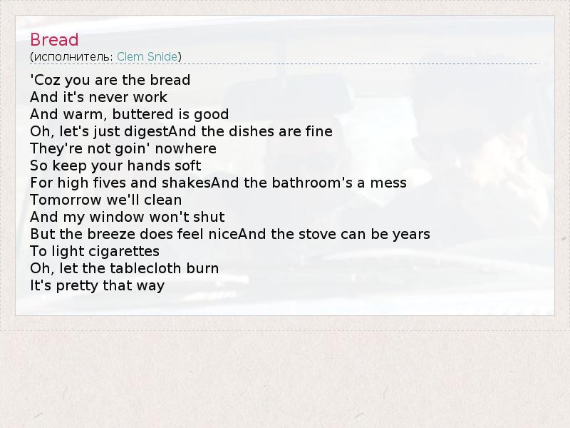 'Coz you are the bread And it's never work And warm, buttered is good Oh, let's just digestAnd the dishes are fine They're not goin' nowhere So keep your hands soft For high fives and shakesAnd the bathroom's a mess Tomorrow we'll clean And my window won't shut But the breeze does feel niceAnd the stove can be years To light cigarettes Oh, let the tablecloth burn It's pretty that way