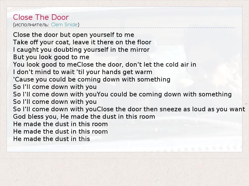 Close the door but open yourself to me Take off your coat, leave it there on the floor I caught you doubting yourself in the mirror But you look good to me You look good to meClose the door, don't let the cold air in I don't mind to wait 'til your hands get warm 'Cause you could be coming down with something So I'll come down with you So I'll come down with youYou could be coming down with something So I'll come down with you So I'll come down with youClose the door then sneeze as loud as you want God bless you, He made the dust in this room He made the dust in this room He made the dust in this room He made the dust in this