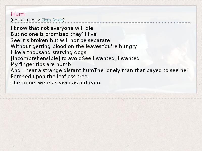 I know that not everyone will die But no one is promised they'll live See it's broken but will not be separate Without getting blood on the leavesYou're hungry Like a thousand starving dogs [Incomprehensible] to avoidSee I wanted, I wanted My finger tips are numb And I hear a strange distant humThe lonely man that payed to see her Perched upon the leafless tree The colors were as vivid as a dream