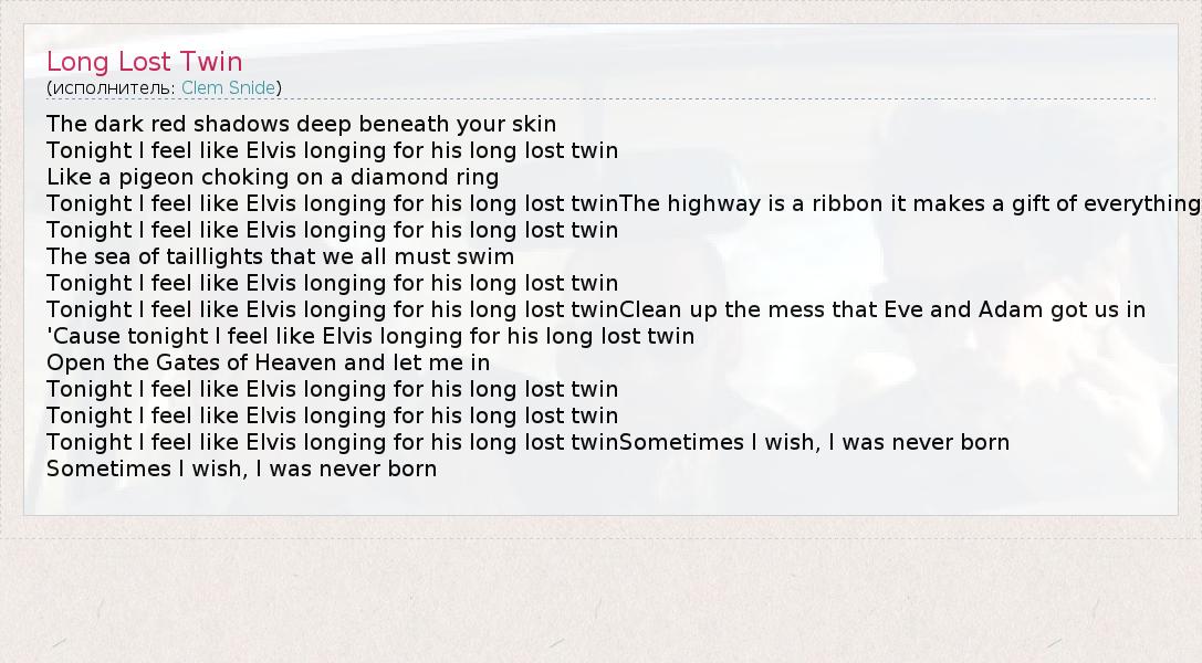 А как ты думаешь, о чем песня "Long Lost Twin" ?