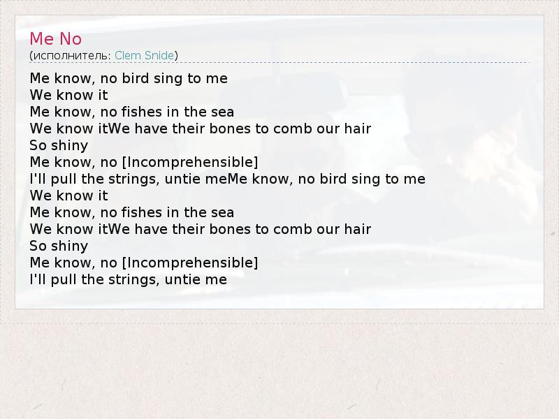 Me know, no bird sing to me We know it Me know, no fishes in the sea We know itWe have their bones to comb our hair So shiny Me know, no [Incomprehensible] I'll pull the strings, untie meMe know, no bird sing to me We know it Me know, no fishes in the sea We know itWe have their bones to comb our hair So shiny Me know, no [Incomprehensible] I'll pull the strings, untie me