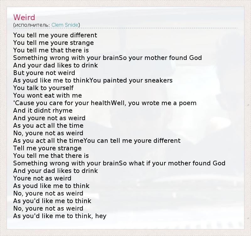 You tell me youre different You tell me youre strange You tell me that there is Something wrong with your brainSo your mother found God And your dad likes to drink But youre not weird As youd like me to thinkYou painted your sneakers You talk to yourself You wont eat with me 'Cause you care for your healthWell, you wrote me a poem And it didnt rhyme And youre not as weird As you act all the time No, youre not as weird As you act all the timeYou can tell me youre different Tell me youre strange You tell me that there is Something wrong with your brainSo what if your mother found God And your dad likes to drink Youre not as weird As youd like me to think No, youre not as weird As you'd like me to think No, youre not as weird As you'd like me to think, hey