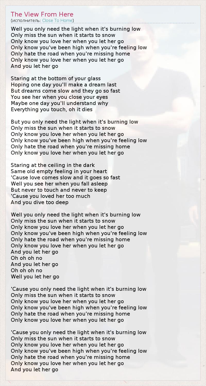 Well you only need the light when it's burning low Only miss the sun when it starts to snow Only know you love her when you let her go Only know you've been high when you're feeling low Only hate the road when you're missing home Only know you love her when you let her go And you let her go Staring at the bottom of your glass Hoping one day you'll make a dream last But dreams come slow and they go so fast You see her when you close your eyes Maybe one day you'll understand why Everything you touch, oh it dies But you only need the light when it's burning low Only miss the sun when it starts to snow Only know you love her when you let her go Only know you've been high when you're feeling low Only hate the road when you're missing home Only know you love her when you let her go Staring at the ceiling in the dark Same old empty feeling in your heart 'Cause love comes slow and it goes so fast Well you see her when you fall asleep But never to touch and never to keep 'Cause you loved her too much And you dive too deep Well you only need the light when it's burning low Only miss the sun when it starts to snow Only know you love her when you let her go Only know you've been high when you're feeling low Only hate the road when you're missing home Only know you love her when you let her go And you let her go Oh oh oh no And you let her go Oh oh oh no Well you let her go 'Cause you only need the light when it's burning low Only miss the sun when it starts to snow Only know you love her when you let her go Only know you've been high when you're feeling low Only hate the road when you're missing home Only know you love her when you let her go 'Cause you only need the light when it's burning low Only miss the sun when it starts to snow Only know you love her when you let her go Only know you've been high when you're feeling low Only hate the road when you're missing home Only know you love her when you let her go And you let her go