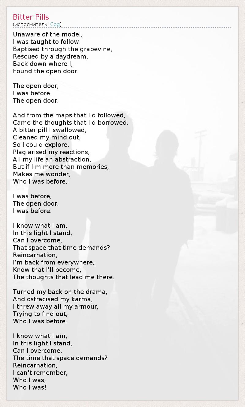 Unaware of the model, I was taught to follow. Baptised through the grapevine, Rescued by a daydream, Back down where I, Found the open door. The open door, I was before. The open door. And from the maps that I'd followed, Came the thoughts that I'd borrowed. A bitter pill I swallowed, Cleaned my mind out, So I could explore. Plagiarised my reactions, All my life an abstraction, But if I'm more than memories, Makes me wonder, Who I was before. I was before, The open door. I was before. I know what I am, In this light I stand, Can I overcome, That space that time demands? Reincarnation, I'm back from everywhere, Know that I'll become, The thoughts that lead me there. Turned my back on the drama, And ostracised my karma, I threw away all my armour, Trying to find out, Who I was before. I know what I am, In this light I stand, Can I overcome, The time that space demands? Reincarnation, I can't remember, Who I was, Who I was!