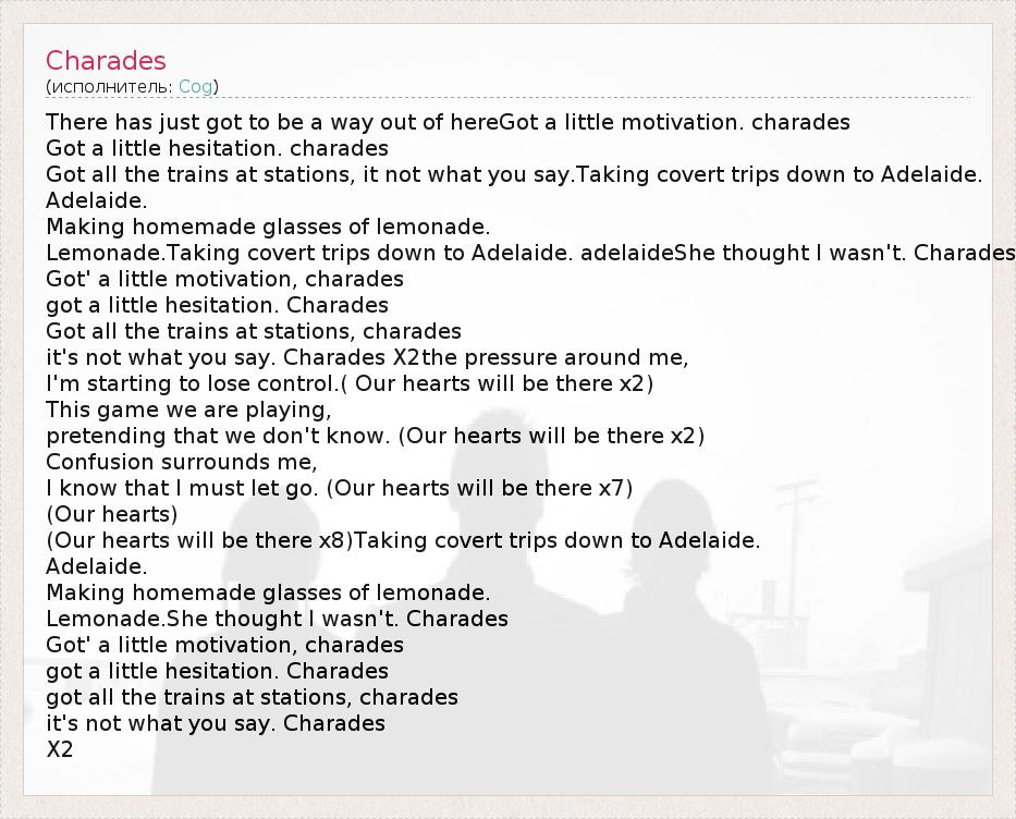 There has just got to be a way out of hereGot a little motivation. charades Got a little hesitation. charades Got all the trains at stations, it not what you say.Taking covert trips down to Adelaide. Adelaide. Making homemade glasses of lemonade. Lemonade.Taking covert trips down to Adelaide. adelaideShe thought I wasn't. Charades Got' a little motivation, charades got a little hesitation. Charades Got all the trains at stations, charades it's not what you say. Charades X2the pressure around me, I'm starting to lose control.( Our hearts will be there x2) This game we are playing, pretending that we don't know. (Our hearts will be there x2) Confusion surrounds me, I know that I must let go. (Our hearts will be there x7) (Our hearts) (Our hearts will be there x8)Taking covert trips down to Adelaide. Adelaide. Making homemade glasses of lemonade. Lemonade.She thought I wasn't. Charades Got' a little motivation, charades got a little hesitation. Charades got all the trains at stations, charades it's not what you say. Charades X2