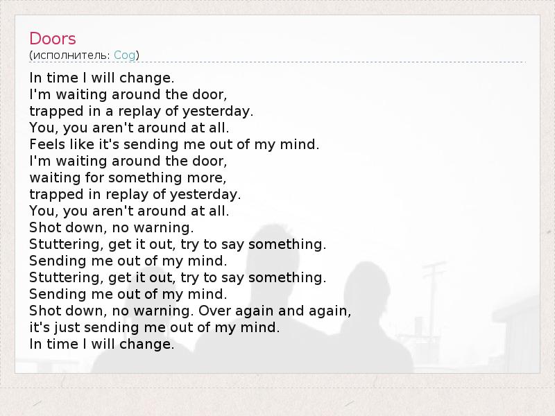 In time I will change. I'm waiting around the door, trapped in a replay of yesterday. You, you aren't around at all. Feels like it's sending me out of my mind. I'm waiting around the door, waiting for something more, trapped in replay of yesterday. You, you aren't around at all. Shot down, no warning. Stuttering, get it out, try to say something. Sending me out of my mind. Stuttering, get it out, try to say something. Sending me out of my mind. Shot down, no warning. Over again and again, it's just sending me out of my mind. In time I will change.