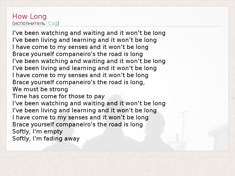 I've been watching and waiting and it won't be long I've been living and learning and it won't be long I have come to my senses and it won't be long Brace yourself companeiro's the road is long I've been watching and waiting and it won't be long I've been living and learning and it won't be long I have come to my senses and it won't be long Brace yourself companeiro's the road is long, We must be strong Time has come for those to pay I've been watching and waiting and it won't be long I've been living and learning and it won't be long I have come to my senses and it won't be long Brace yourself companeiro's the road is long Softly, I'm empty Softly, I'm fading away