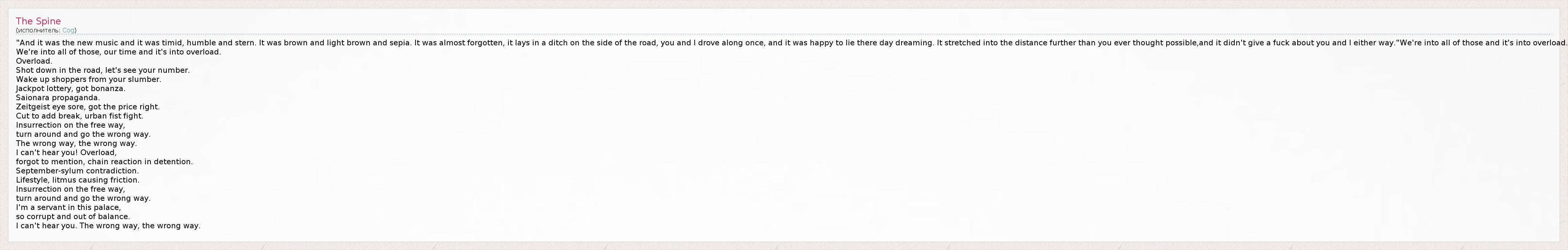 "And it was the new music and it was timid, humble and stern. It was brown and light brown and sepia. It was almost forgotten, it lays in a ditch on the side of the road, you and I drove along once, and it was happy to lie there day dreaming. It stretched into the distance further than you ever thought possible,and it didn't give a fuck about you and I either way."We're into all of those and it's into overload. We're into all of those, our time and it's into overload. Overload. Shot down in the road, let's see your number. Wake up shoppers from your slumber. Jackpot lottery, got bonanza. Saionara propaganda. Zeitgeist eye sore, got the price right. Cut to add break, urban fist fight. Insurrection on the free way, turn around and go the wrong way. The wrong way, the wrong way. I can't hear you! Overload, forgot to mention, chain reaction in detention. September-sylum contradiction. Lifestyle, litmus causing friction. Insurrection on the free way, turn around and go the wrong way. I'm a servant in this palace, so corrupt and out of balance. I can't hear you. The wrong way, the wrong way.