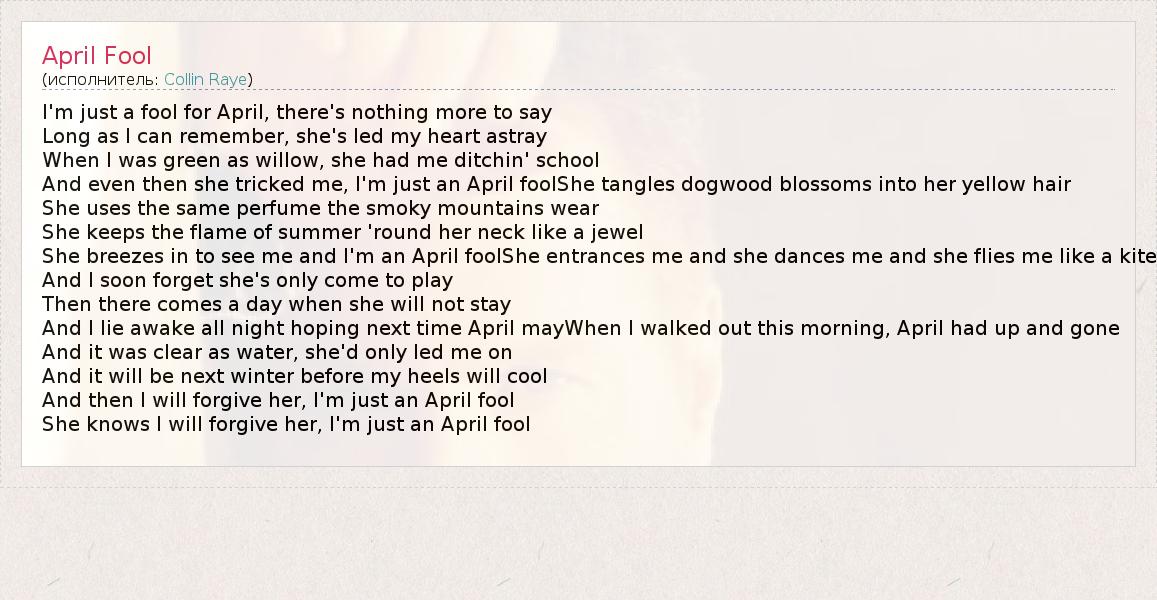 I'm just a fool for April, there's nothing more to say Long as I can remember, she's led my heart astray When I was green as willow, she had me ditchin' school And even then she tricked me, I'm just an April foolShe tangles dogwood blossoms into her yellow hair She uses the same perfume the smoky mountains wear She keeps the flame of summer 'round her neck like a jewel She breezes in to see me and I'm an April foolShe entrances me and she dances me and she flies me like a kite And I soon forget she's only come to play Then there comes a day when she will not stay And I lie awake all night hoping next time April mayWhen I walked out this morning, April had up and gone And it was clear as water, she'd only led me on And it will be next winter before my heels will cool And then I will forgive her, I'm just an April fool She knows I will forgive her, I'm just an April fool
