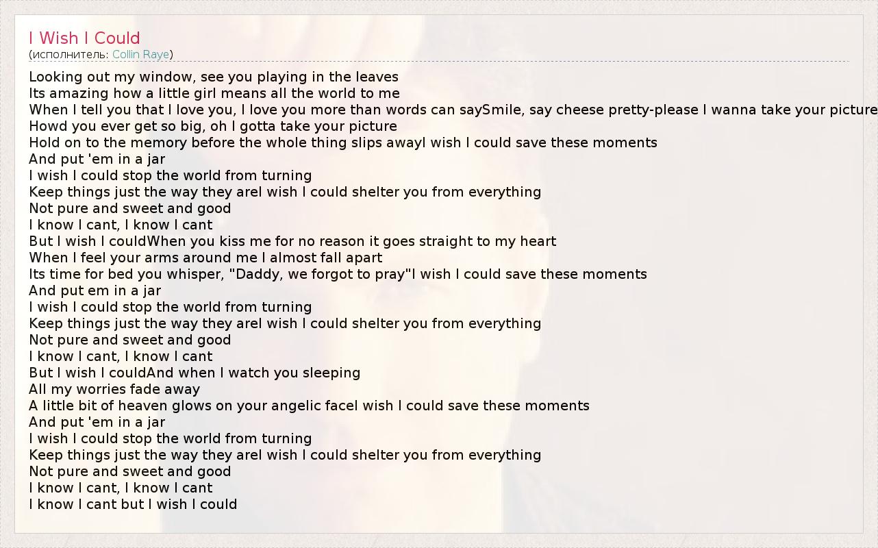 Looking out my window, see you playing in the leaves Its amazing how a little girl means all the world to me When I tell you that I love you, I love you more than words can saySmile, say cheese pretty-please I wanna take your picture Howd you ever get so big, oh I gotta take your picture Hold on to the memory before the whole thing slips awayI wish I could save these moments And put 'em in a jar I wish I could stop the world from turning Keep things just the way they areI wish I could shelter you from everything Not pure and sweet and good I know I cant, I know I cant But I wish I couldWhen you kiss me for no reason it goes straight to my heart When I feel your arms around me I almost fall apart Its time for bed you whisper, "Daddy, we forgot to pray"I wish I could save these moments And put em in a jar I wish I could stop the world from turning Keep things just the way they areI wish I could shelter you from everything Not pure and sweet and good I know I cant, I know I cant But I wish I couldAnd when I watch you sleeping All my worries fade away A little bit of heaven glows on your angelic faceI wish I could save these moments And put 'em in a jar I wish I could stop the world from turning Keep things just the way they areI wish I could shelter you from everything Not pure and sweet and good I know I cant, I know I cant I know I cant but I wish I could