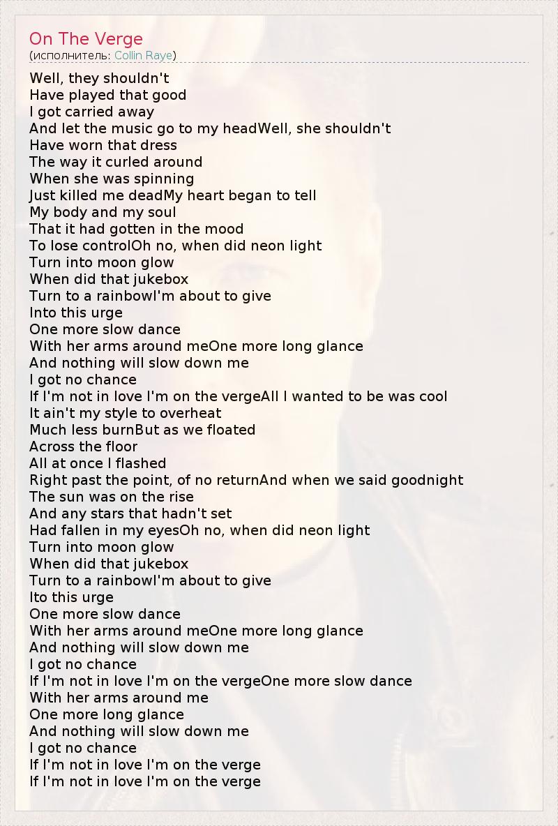 Well, they shouldn't Have played that good I got carried away And let the music go to my headWell, she shouldn't Have worn that dress The way it curled around When she was spinning Just killed me deadMy heart began to tell My body and my soul That it had gotten in the mood To lose controlOh no, when did neon light Turn into moon glow When did that jukebox Turn to a rainbowI'm about to give Into this urge One more slow dance With her arms around meOne more long glance And nothing will slow down me I got no chance If I'm not in love I'm on the vergeAll I wanted to be was cool It ain't my style to overheat Much less burnBut as we floated Across the floor All at once I flashed Right past the point, of no returnAnd when we said goodnight The sun was on the rise And any stars that hadn't set Had fallen in my eyesOh no, when did neon light Turn into moon glow When did that jukebox Turn to a rainbowI'm about to give Ito this urge One more slow dance With her arms around meOne more long glance And nothing will slow down me I got no chance If I'm not in love I'm on the vergeOne more slow dance With her arms around me One more long glance And nothing will slow down me I got no chance If I'm not in love I'm on the verge If I'm not in love I'm on the verge